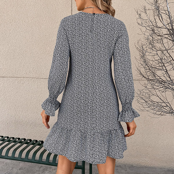 Fresh Style Long Sleeve Round Neck Ruffle Hem Printed Dress