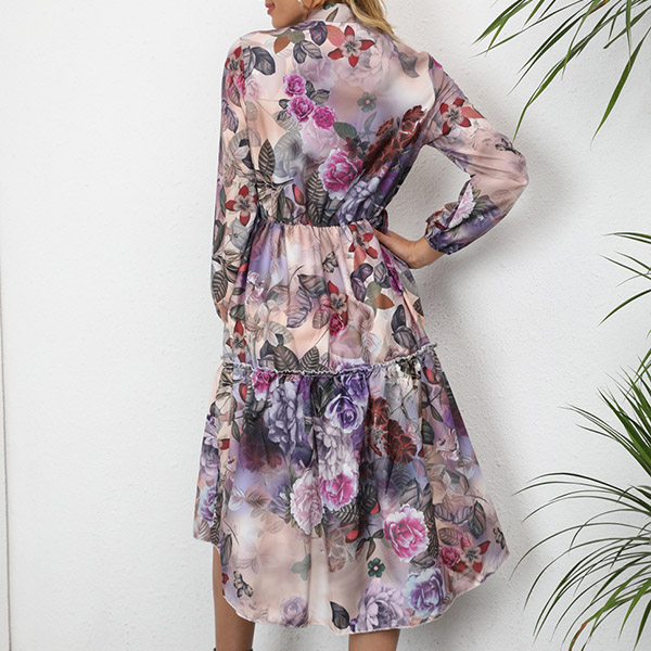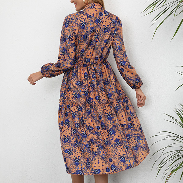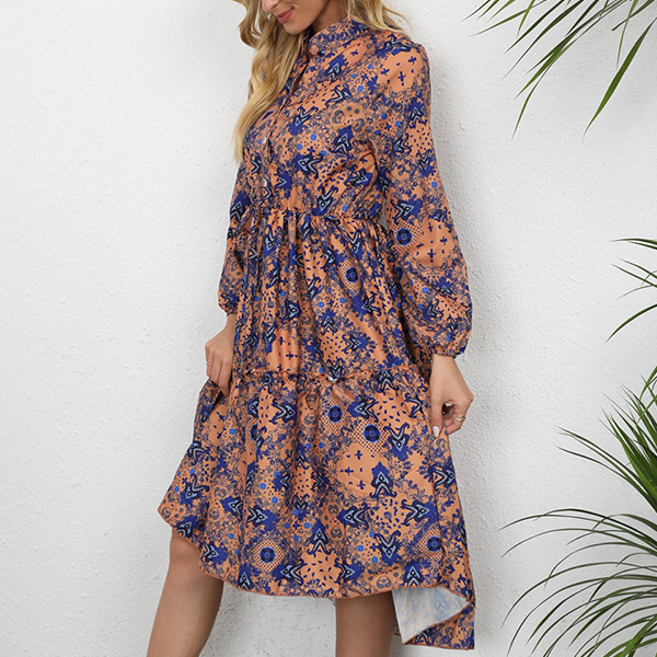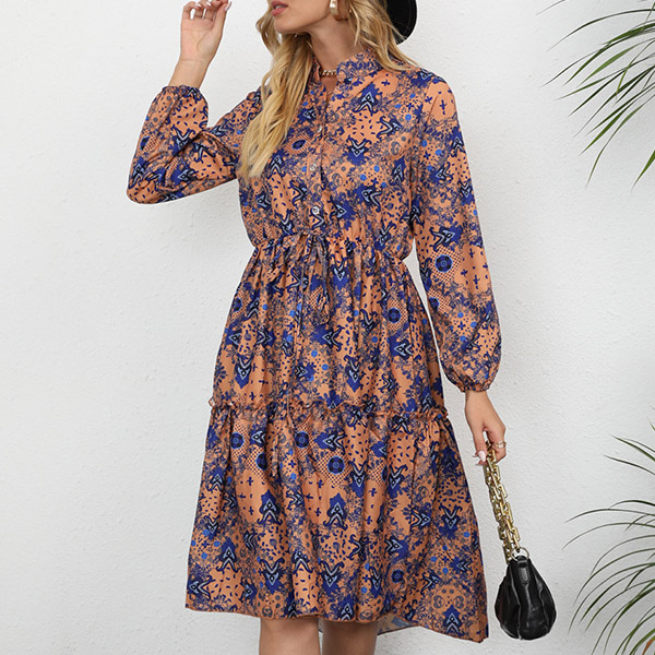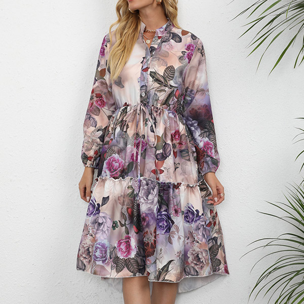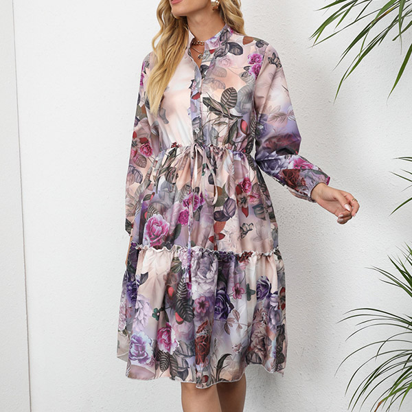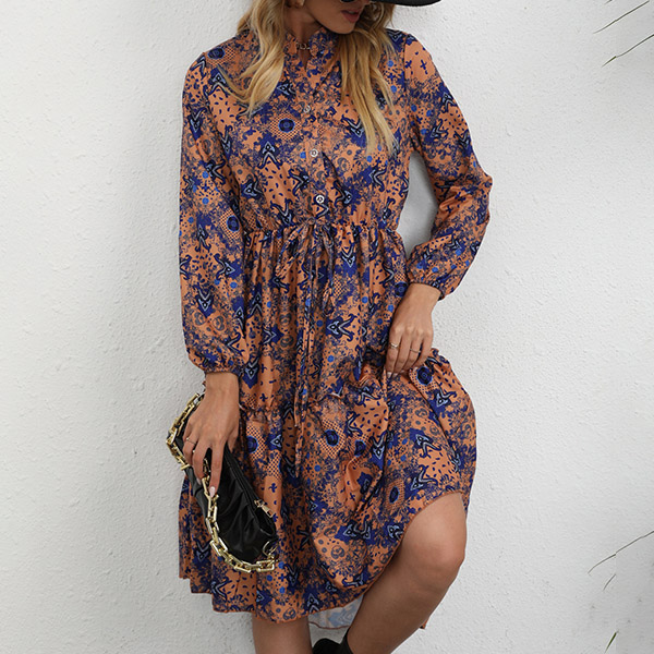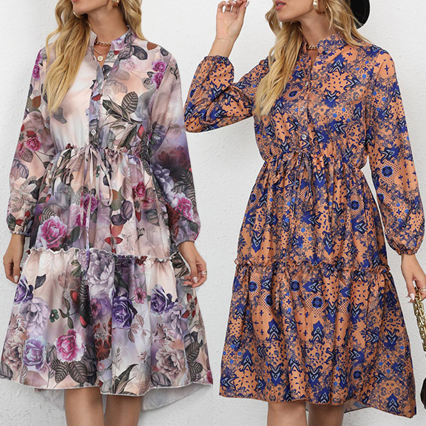 It is an easy thing to achieve for a fresh and sweet daily look with the help of this printed dress. Its chic printed details will help you catch more eyes. Finished with long sleeve,stand collar and drawstring waist,this dress not only can showcase your figure,but also can make you look effortlessly charming and beautiful!