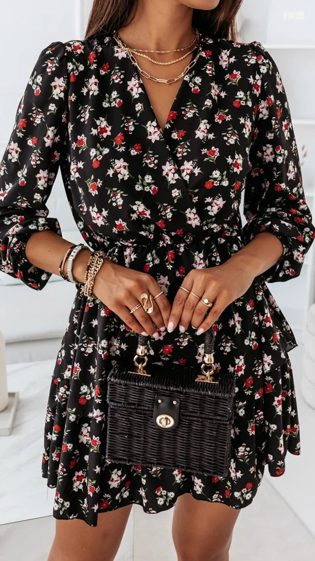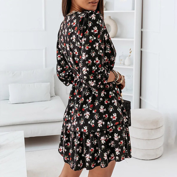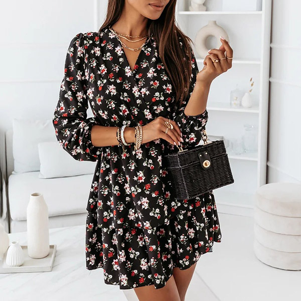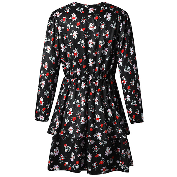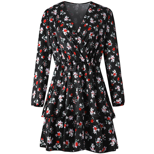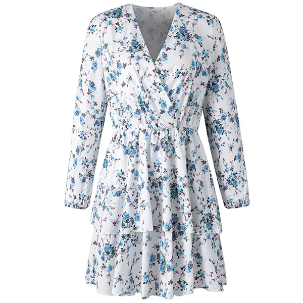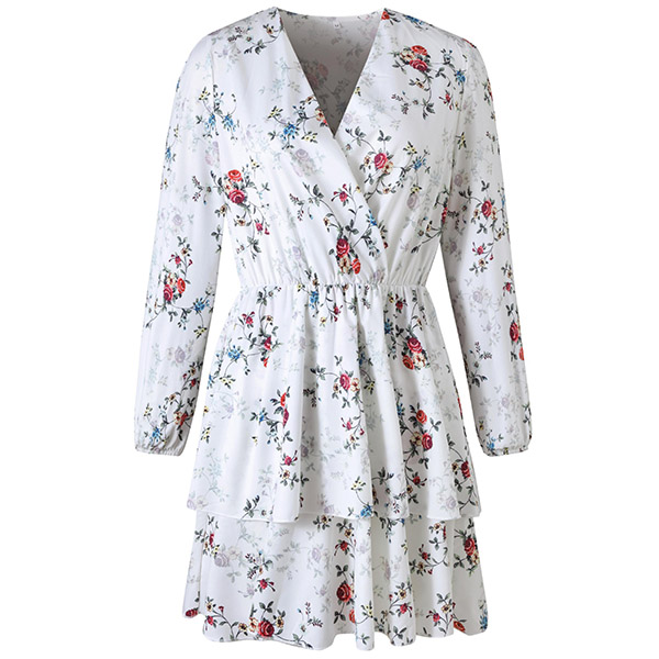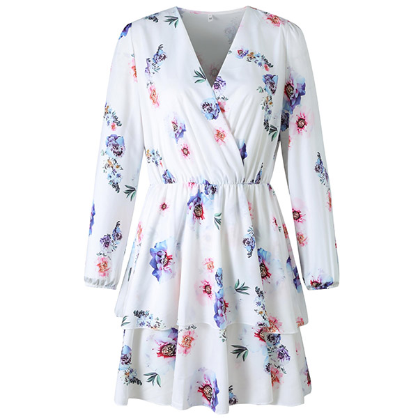 Make your wardrobe more colorful by adding this printed dress. Its vibrant floral print details will help you catch more eyes. Finished with long sleeve,v-neck and dual-layer hem design,this dress also can express your sweet yet feminine side. Just add this dress to your wardrobe and it won't let you disappointed!