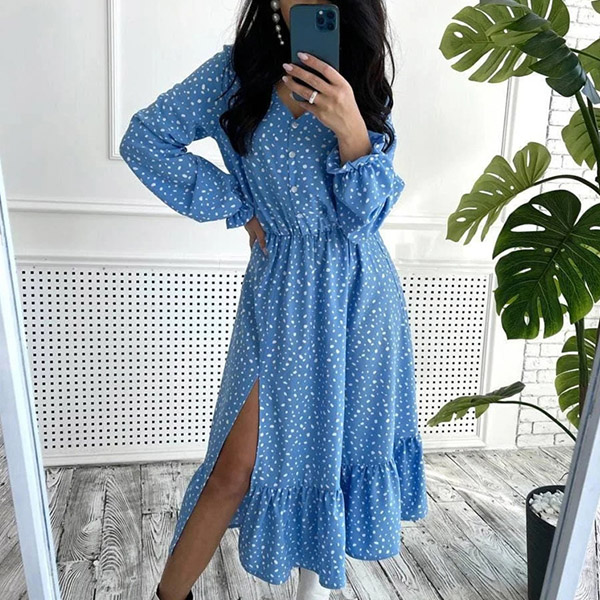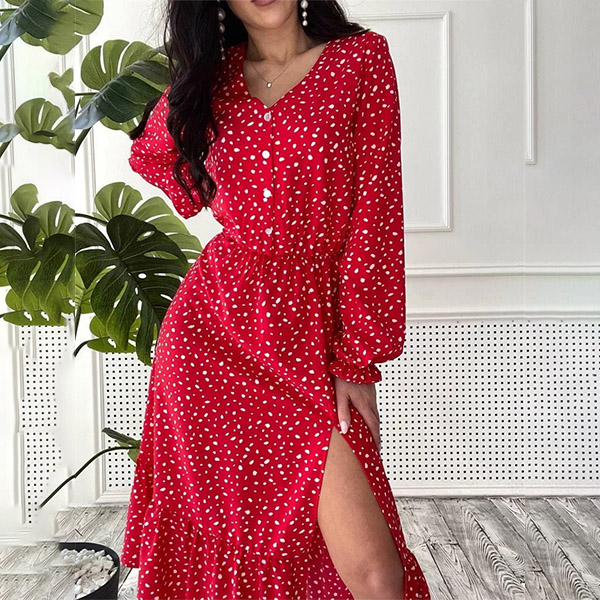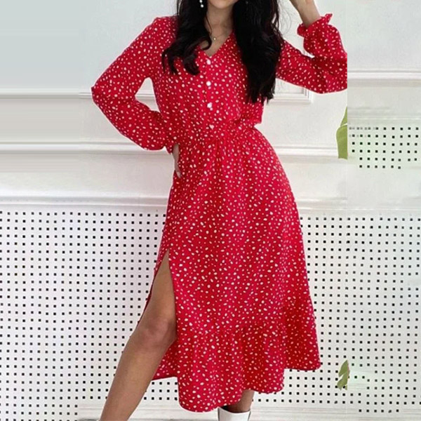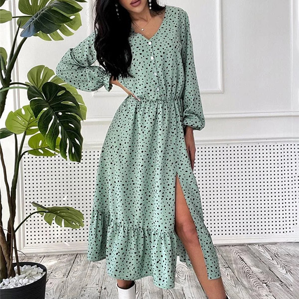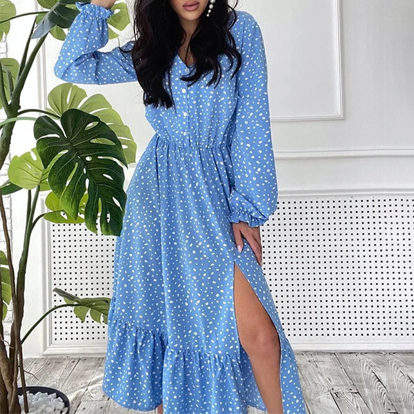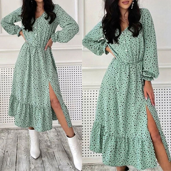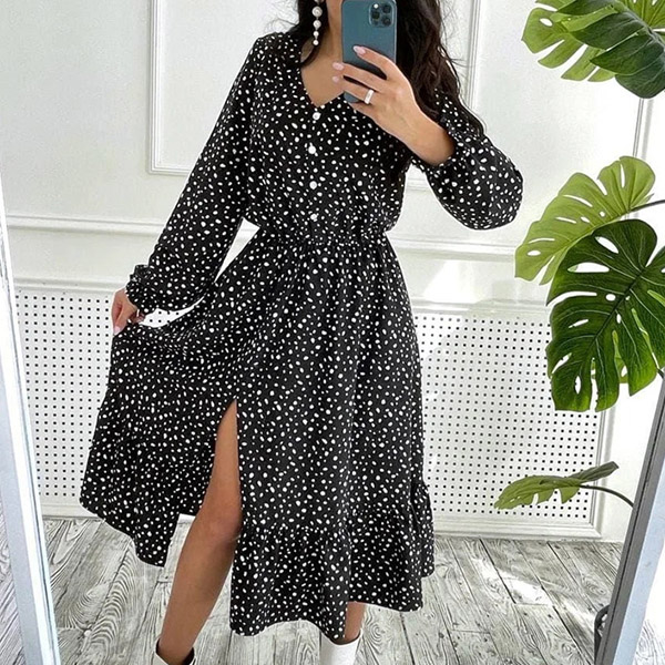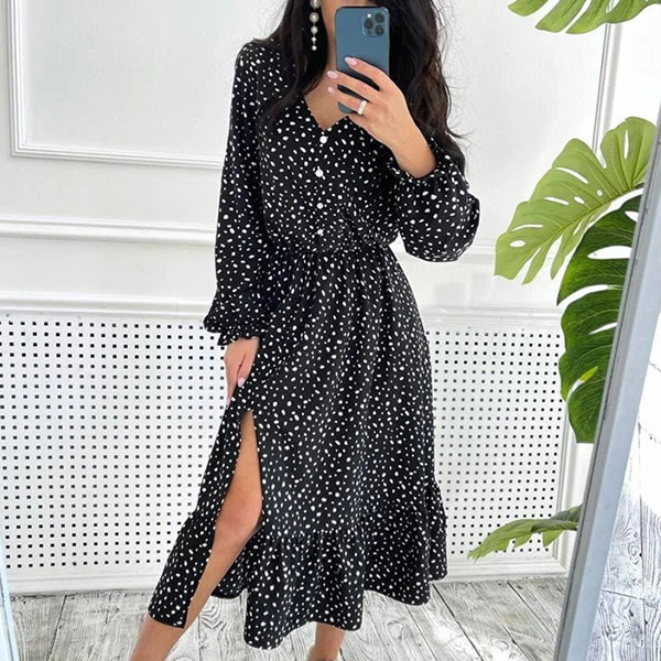 As for a fresh,sweet and stylish daily look,this dress can be your perfect partner. The v-neck and slit hem design will exude your feminine appeal,while the dots printed details can offer you a more playful and eye-catching look. From your daytime out to night dating to weekend trips,this dress can give you an easy transition.