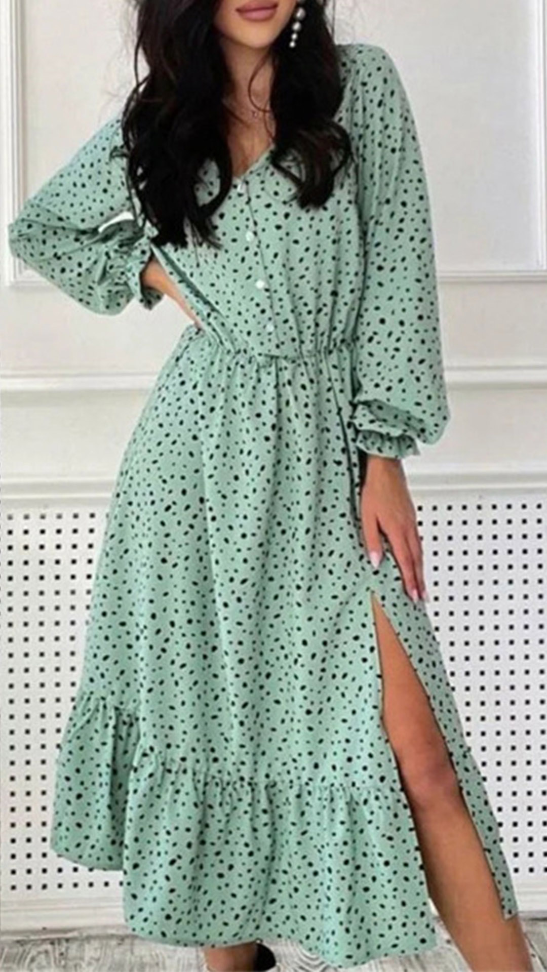 Fresh Style Long Sleeve V-neck Slit Hem Dots Printed Dress