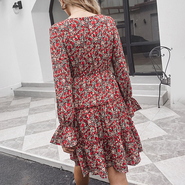 Fresh Style Puff Sleeve V-neck Ruffle Hem Printed Dress