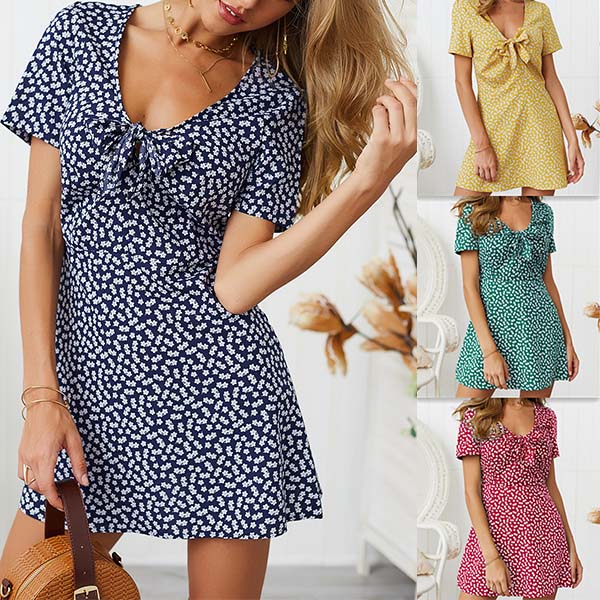 For a fresh and sweet weekend look,you can have a try this dress. Features vibrant floral print details,with short sleeve and knotted v-neck design,this dress can keep you feeling comfy while it exudes your charm and beauty. It is worth to be your wardrobe staple in these summer days.