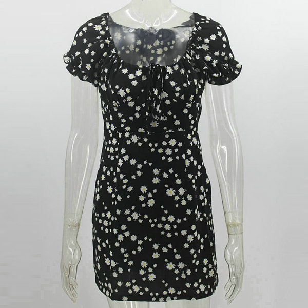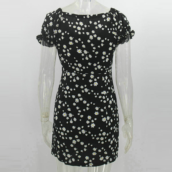Fresh Style Short Sleeve V-neck Daisy Printed Slim Fit Dress