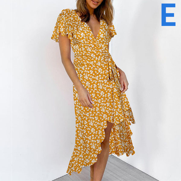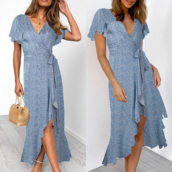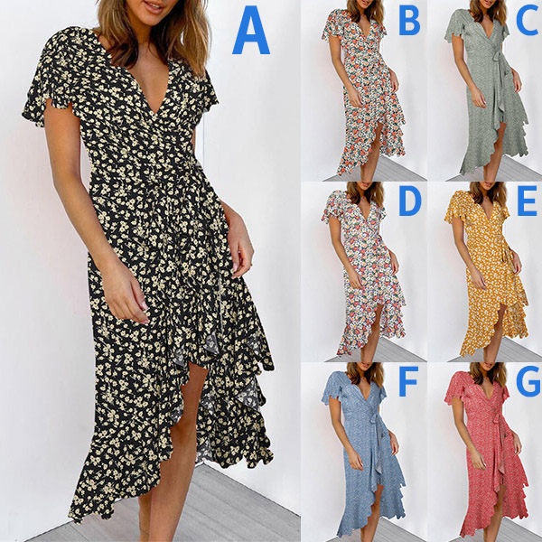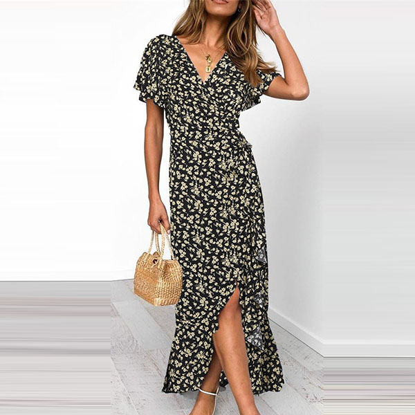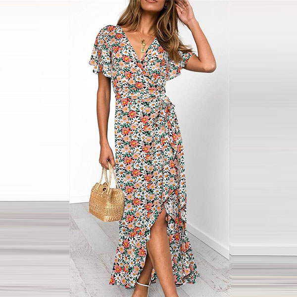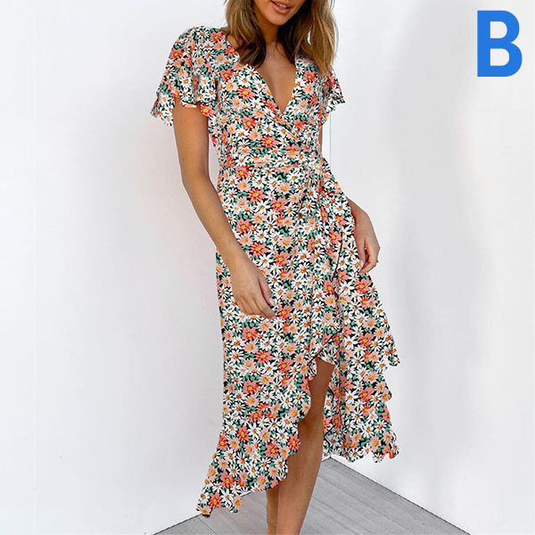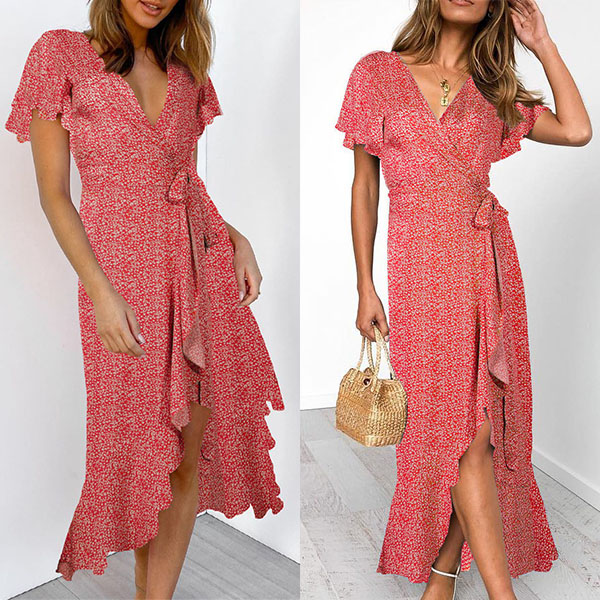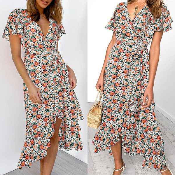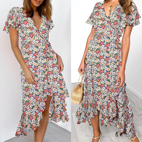 Any girl can look effortlessly charming and beautiful in this dress. It features vibrant floral print details,which can help you catch more eyes. Finished with short sleeve,v-neck and an irregular ruffle hem,this dress also can exude your charming femininity and sweet vibes. No matter for your daytime out or night dating,this dress can be your wise choice.