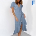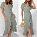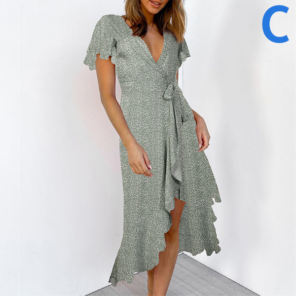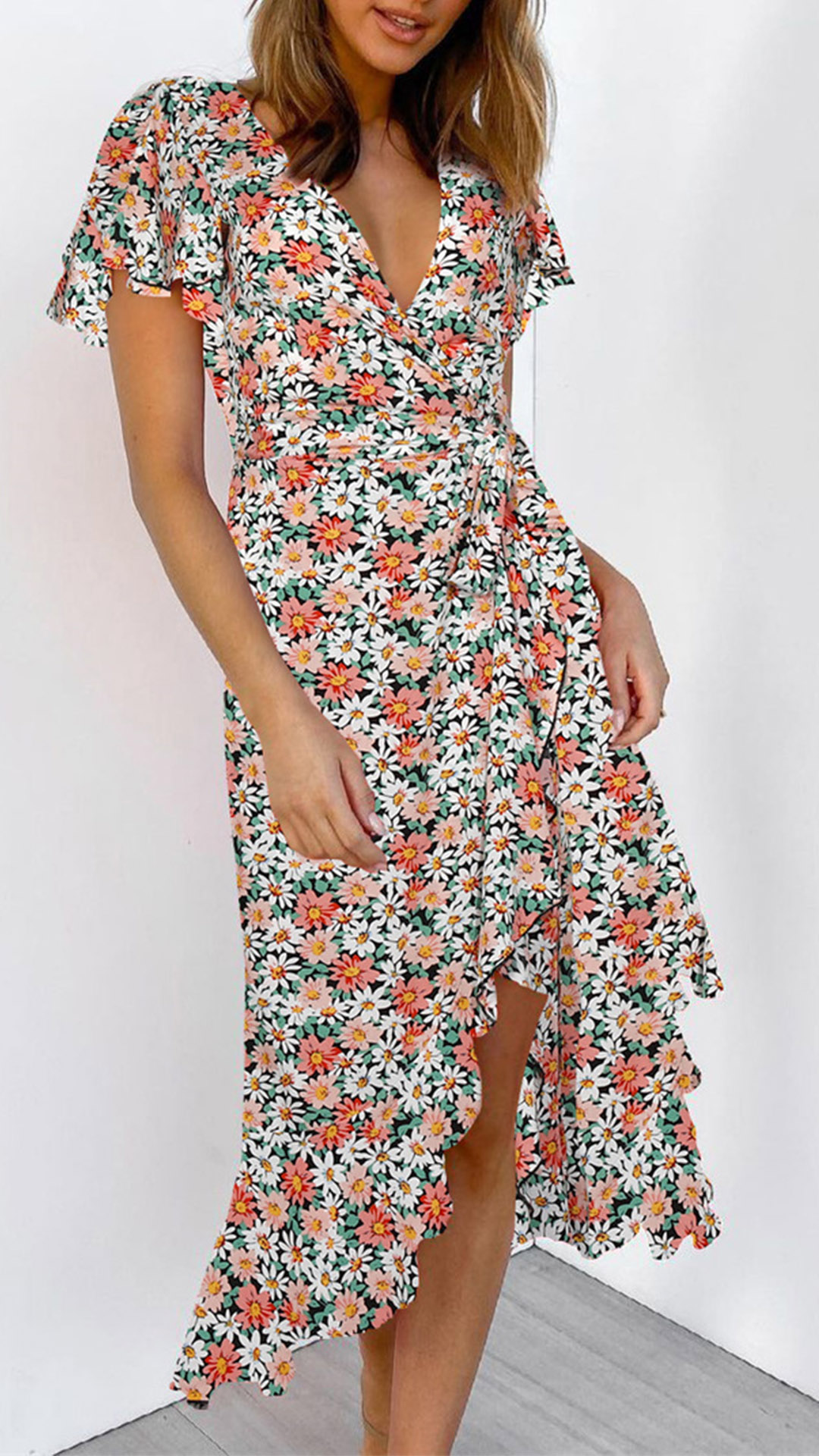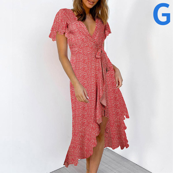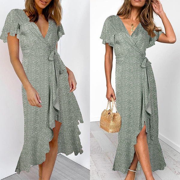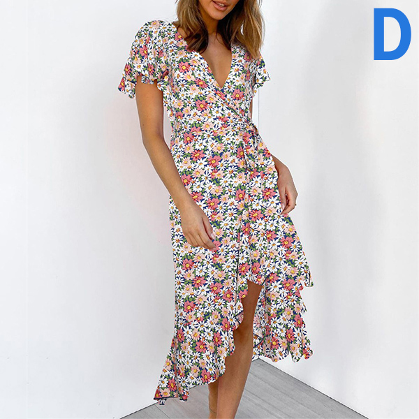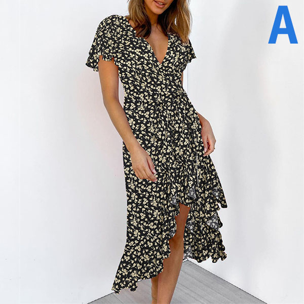 Any girl can look effortlessly charming and beautiful in this dress. It features vibrant floral print details,which can help you catch more eyes. Finished with short sleeve,v-neck and an irregular ruffle hem,this dress also can exude your charming femininity and sweet vibes. No matter for your daytime out or night dating,this dress can be your wise choice.