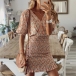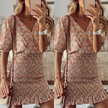 Fresh Style Short Sleeve V-neck Ruffle Hem Slim Fit Printed Dress