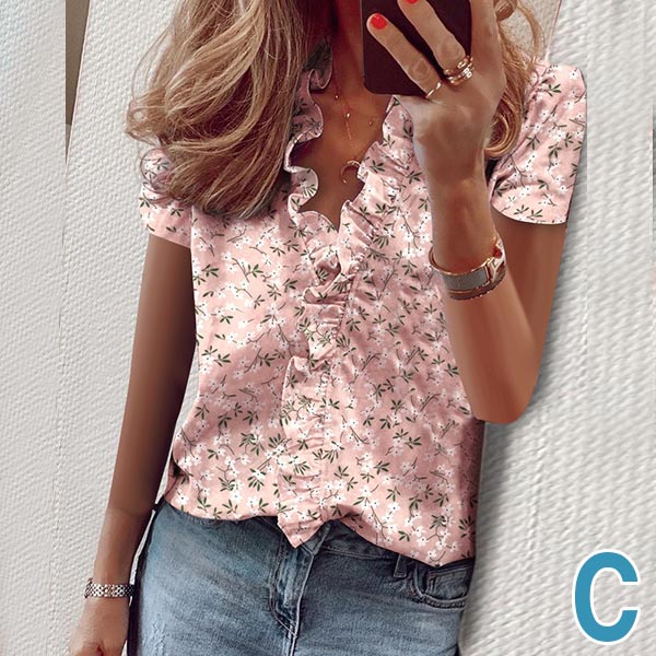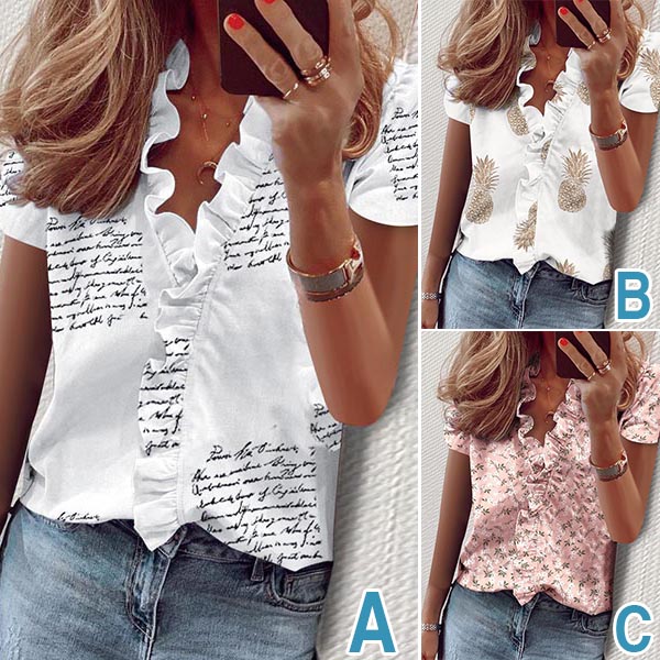 It is a good chance to add a dash of fresh and sweet vibes to your wardrobe with this blouse. Outfitted with short sleeve,v-neck,chic printed details and ruffle design,this wonderful piece knows how to keep the comfy while it exudes your style and charm. You can match it with your favourite pants or skirt to achieve for an eye-catching look.
