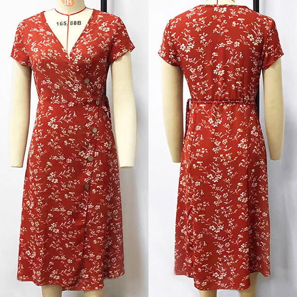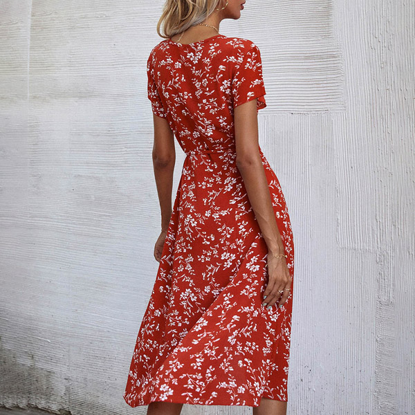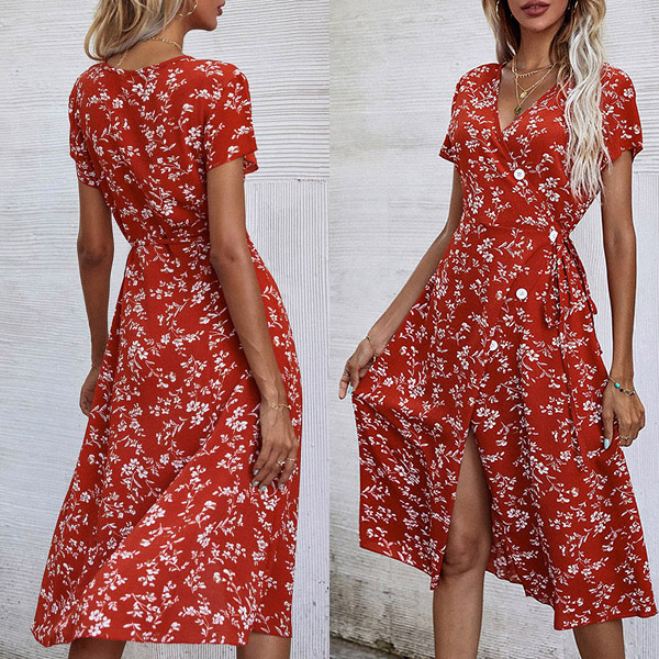 Wanna achieve for a fresh and sweet summer look? Then you can have a try this dress. The vibrant and eye-catching printed details can help you catch more eyes. Finished with short sleeve,v-neck and slit hem design,sexy,sassy and flirty. In addition,the tie-belt design at the waist part can better showcase your waistline and figure. So why not take interest in it?