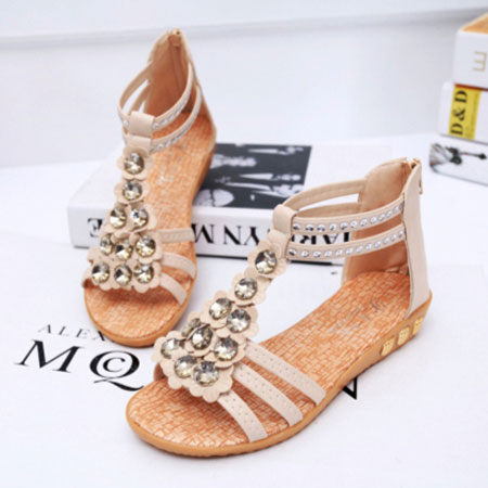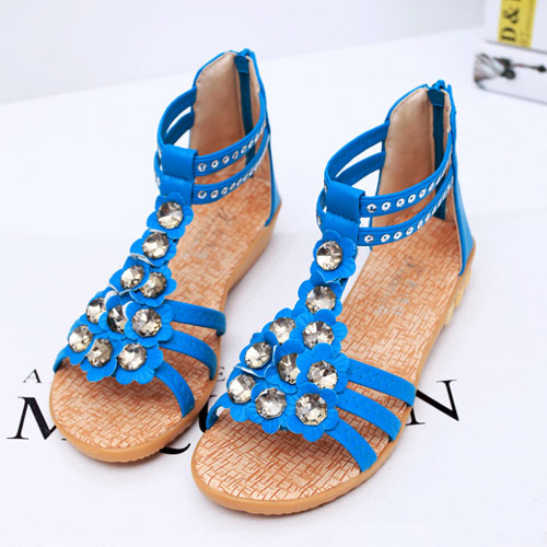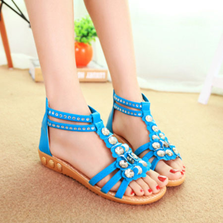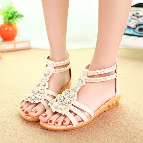 Roman style is a totally hot trend this summer.The sandal features an open toe,a low wedge heel,back zip up closure,stitching details at the straps and decorated with rhinestones,sequins and flower trinkets.