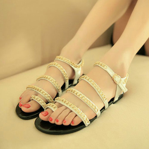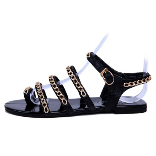 The street-chic sandal is a toe loop style and features straps fully set with metal chain links in gold tone and side buckle closure.It's sure to take your any outfit to the next level.