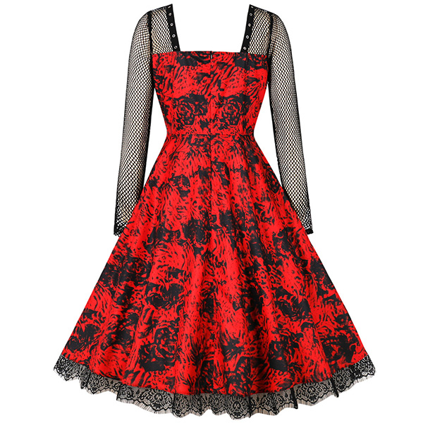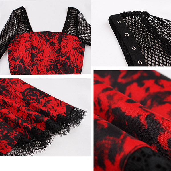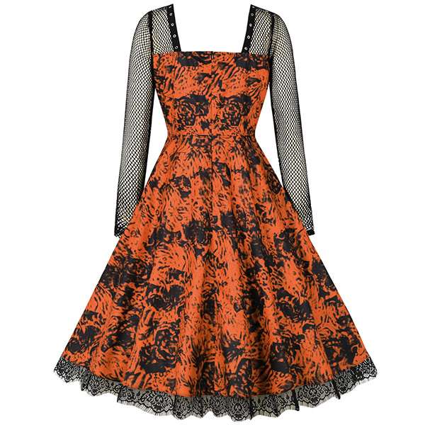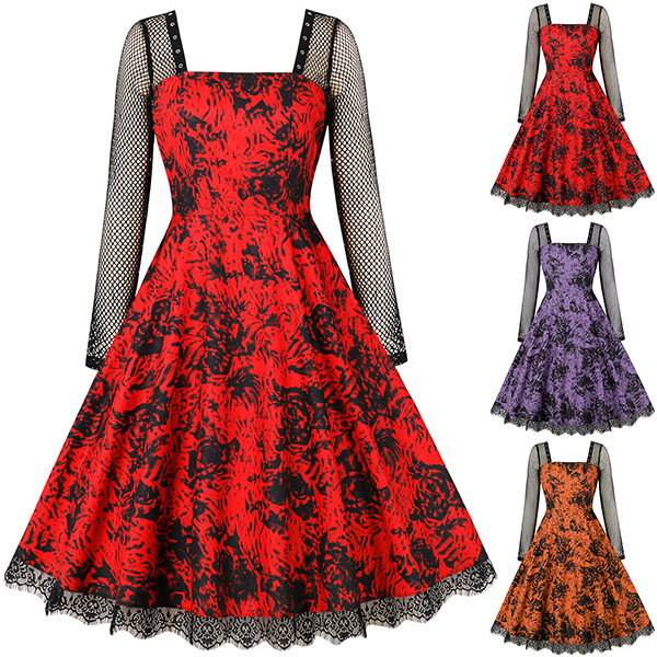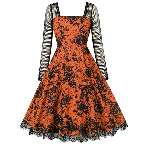 Gothic Style Lace Spliced Square Neck Long Sleeve Printed Dress for Halloween Cosplay Costume
