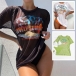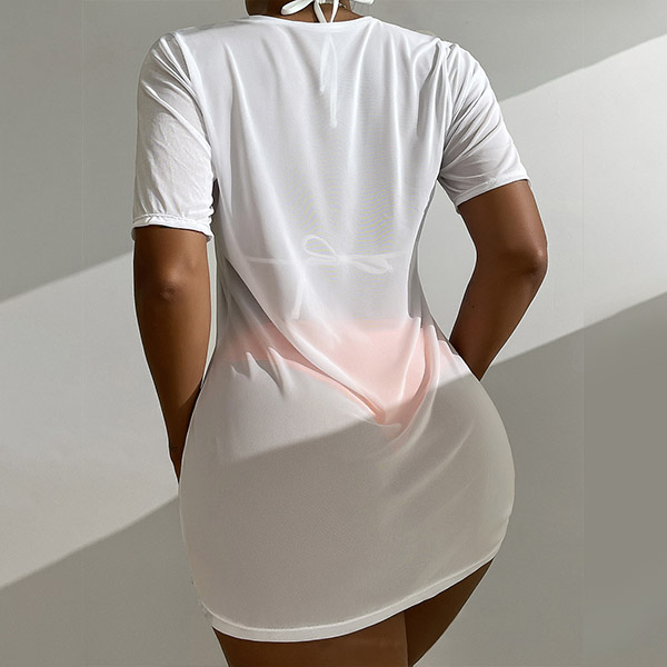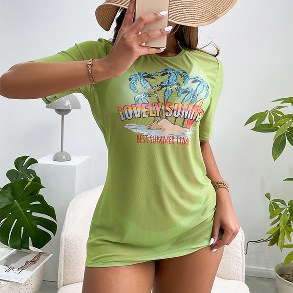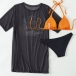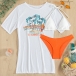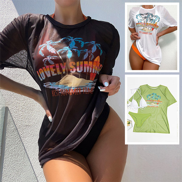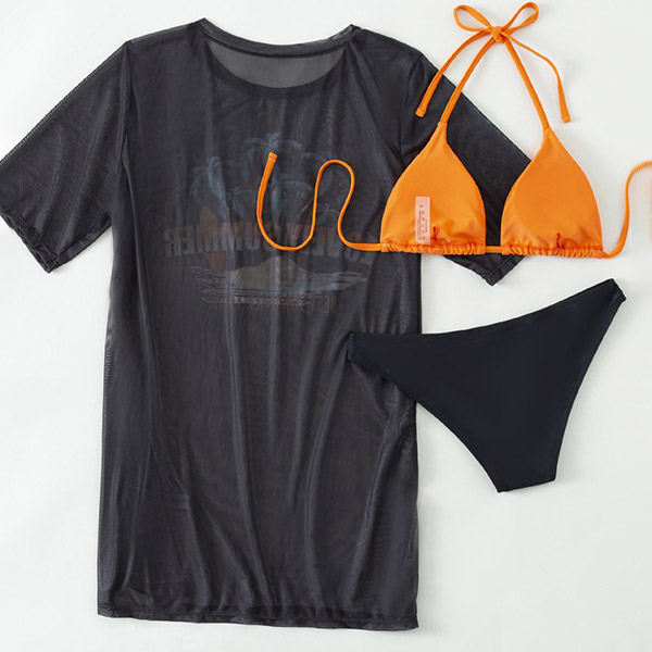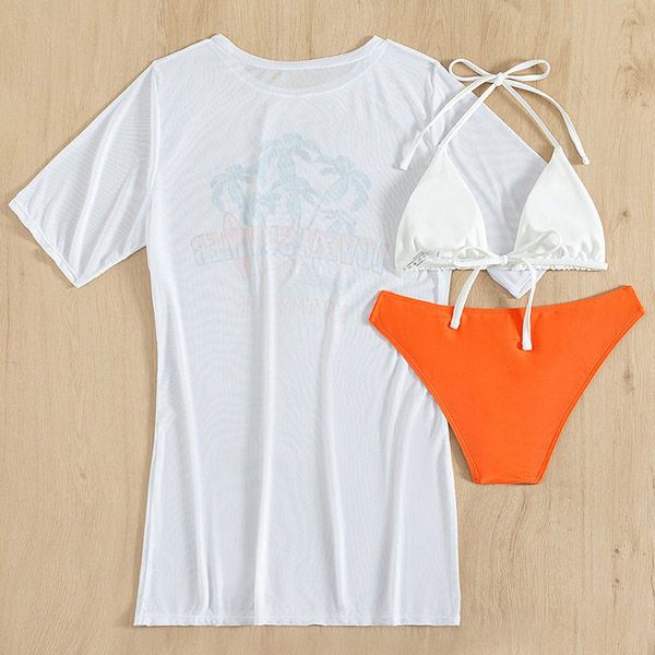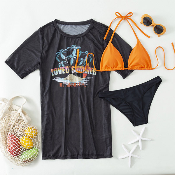 Hawaii Style Printed Three-piece Swimsuit consist of Printed Swim Cover-up Shirt, Halter Bikini Top and Low-rise Bikini Bottoms