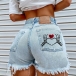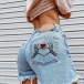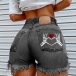 Heart and Skull Print Ripped Denim Shorts with Tassel Trim