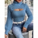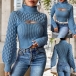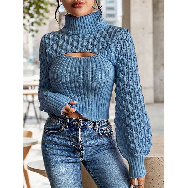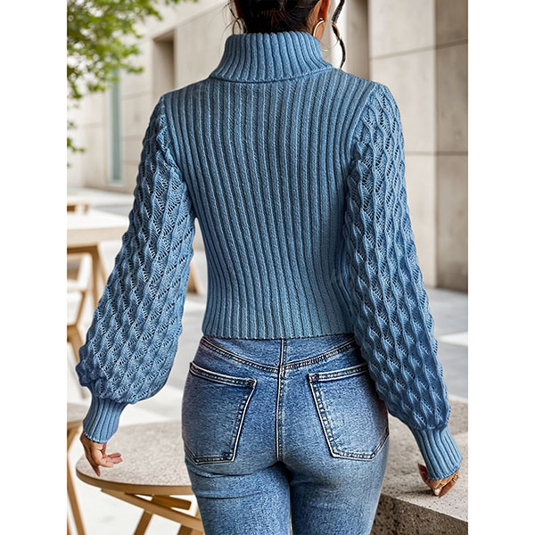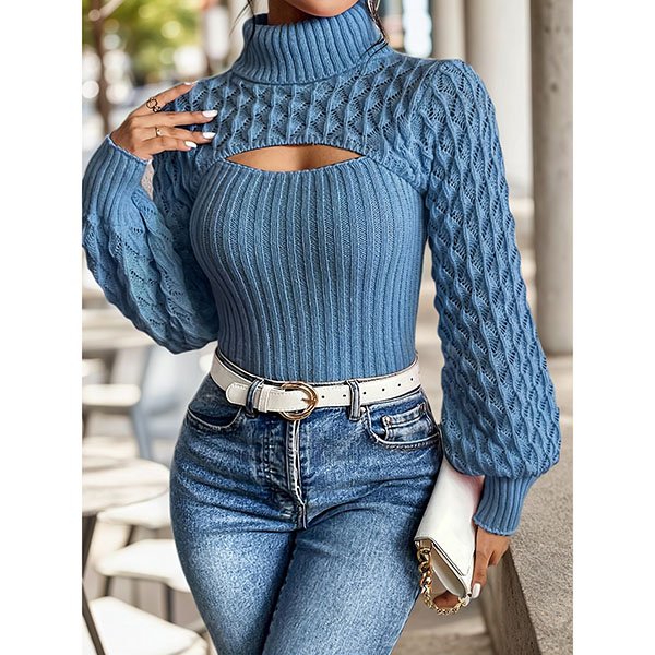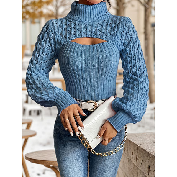 High Neck Lantern Sleeve Sweater with Hollow Knit Detail