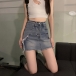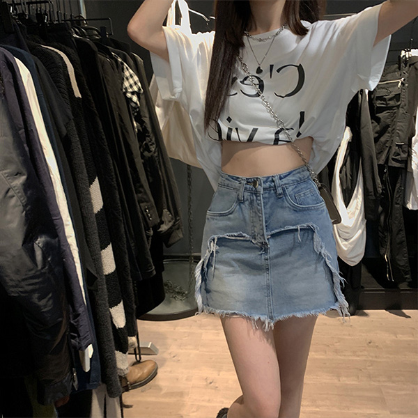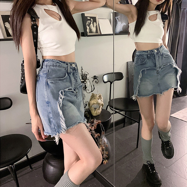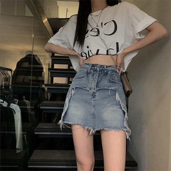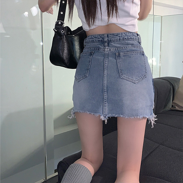 High Waist A Line Denim Skirt Distressed Jean Skirt with Frayed Hem