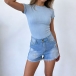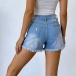 These denim shorts feature modern high-rise styling with edgy frayed hemline construction and authentic old-washed denim for fashion-forward casual elegance. Perfect for daily wear.