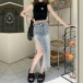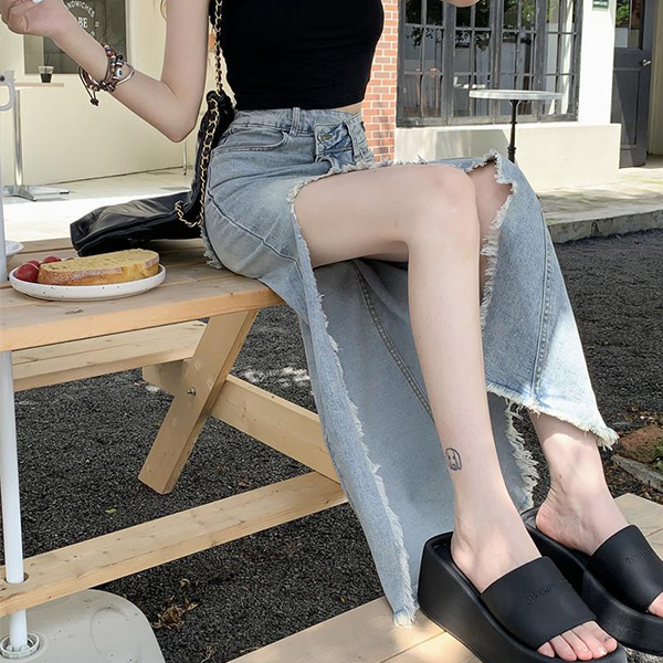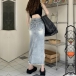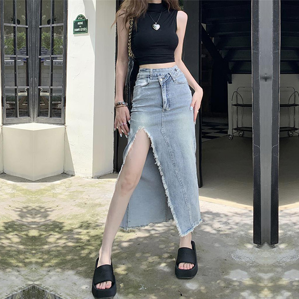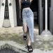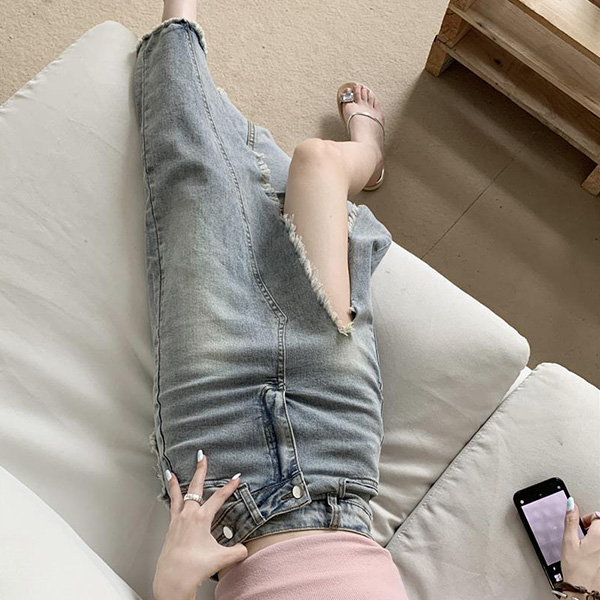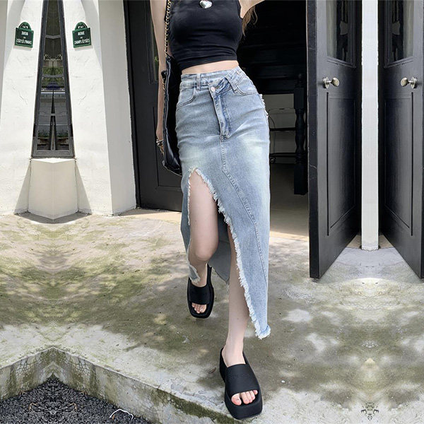 Irregular Slit Denim Shirt Dress Distressed Button Down Jean Dress with Asymmetric Hemline
