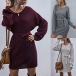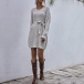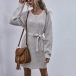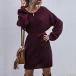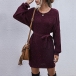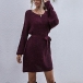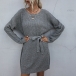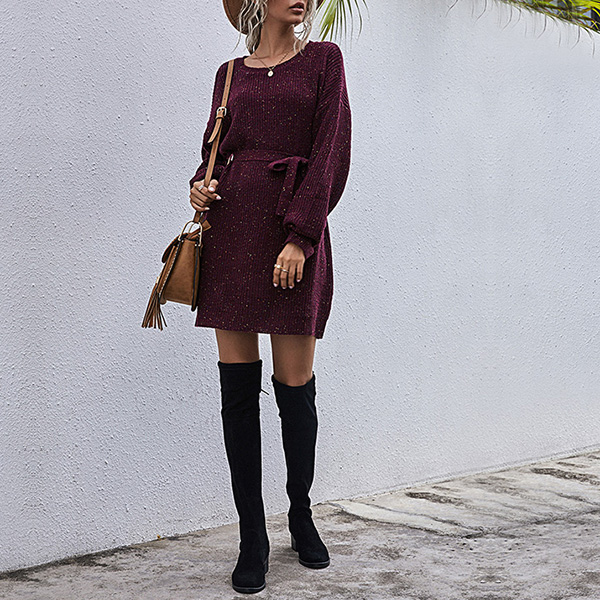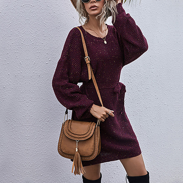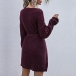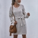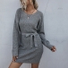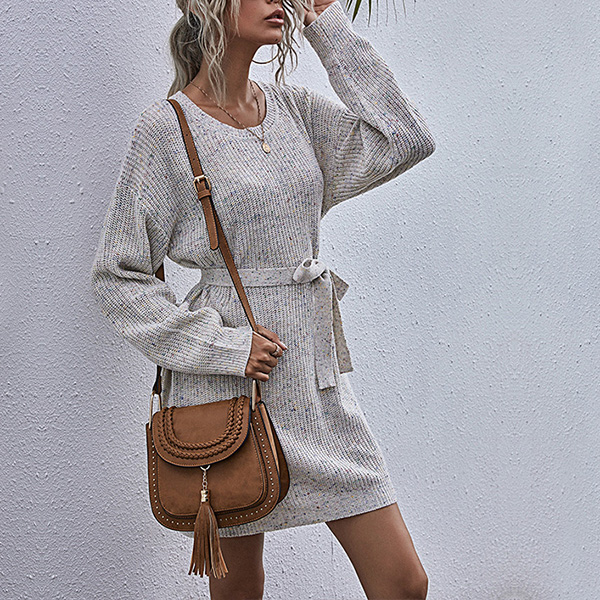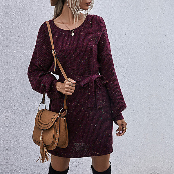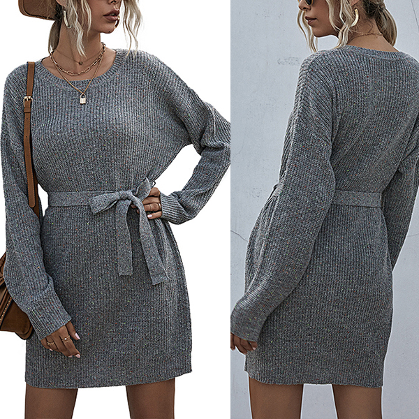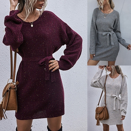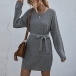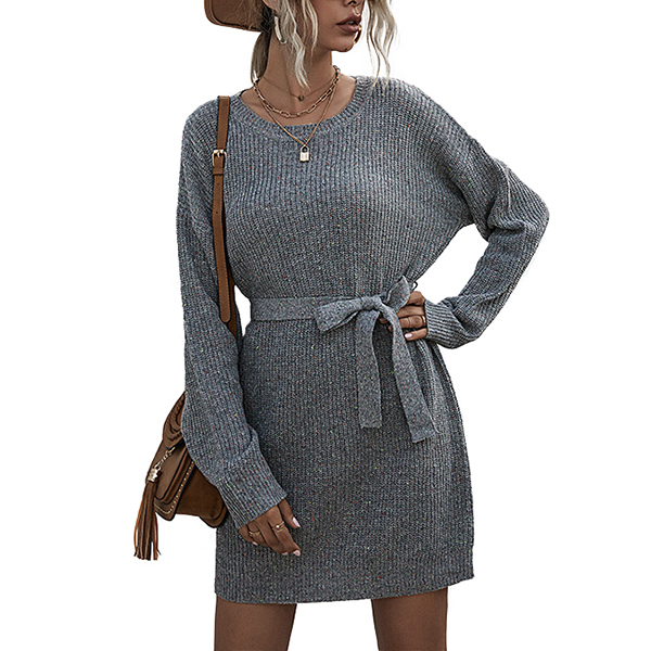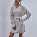 Fashion Crew Neck Long Sleeve Self-tie Knitted Sweater Dress