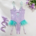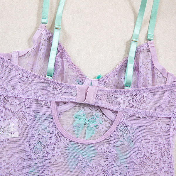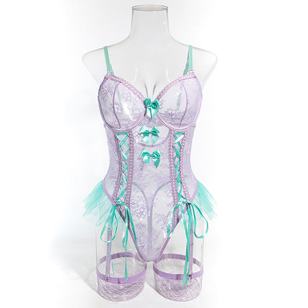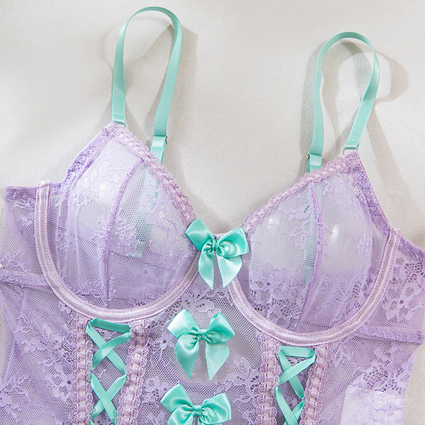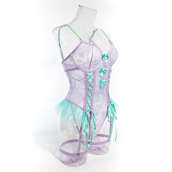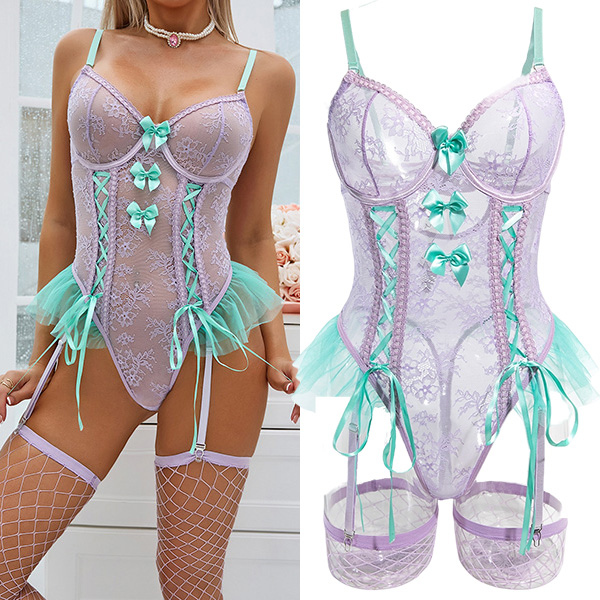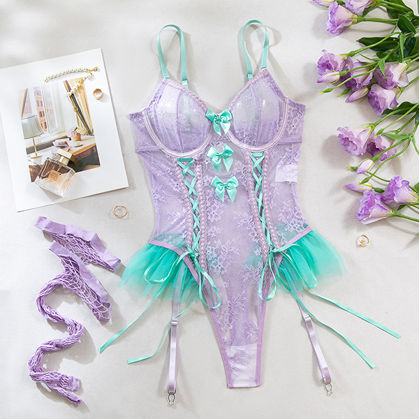 Sexy Contrast Color Bowknot Lace-up Lace Lingerie Bodysuit with Mesh-socks