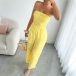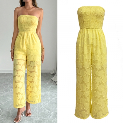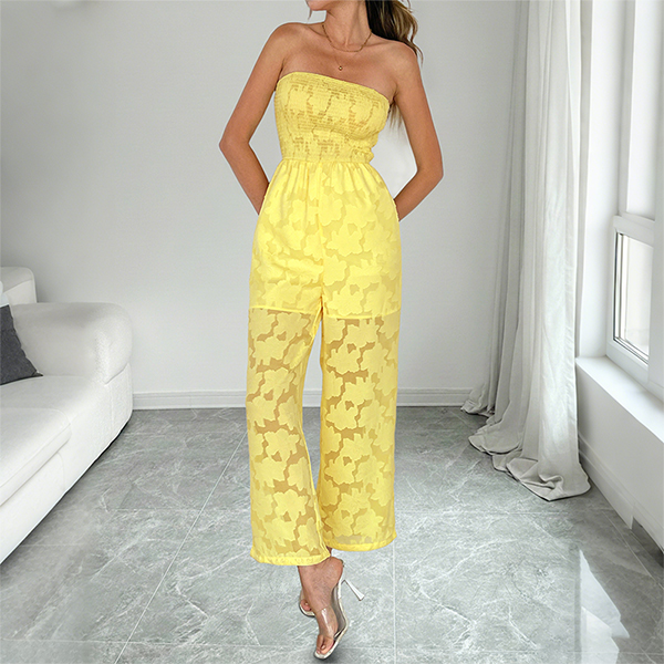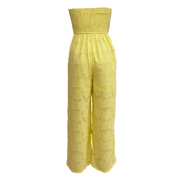 Lemon Yellow Floral Lace Jumpsuit - Strapless Smocked Bodice & Wide Leg - Summer Beach Outfit