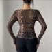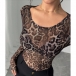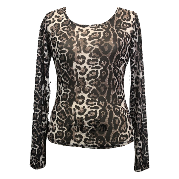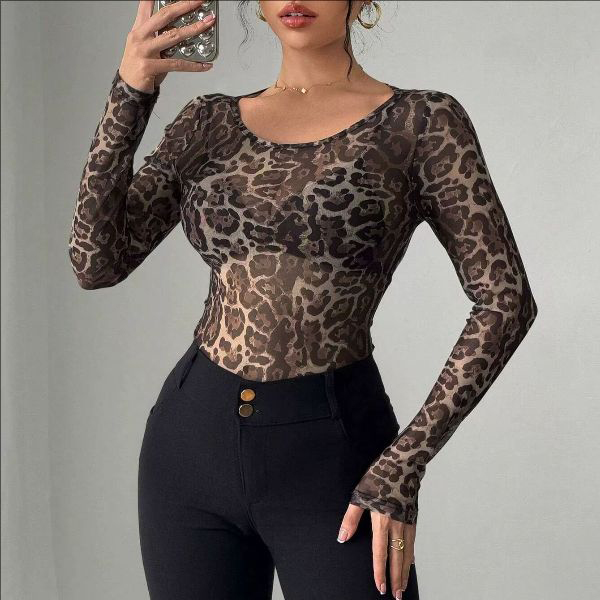 Leopard Print Mesh T-Shirt with Long Sleeves and Slim-Fit Round Neck Design
