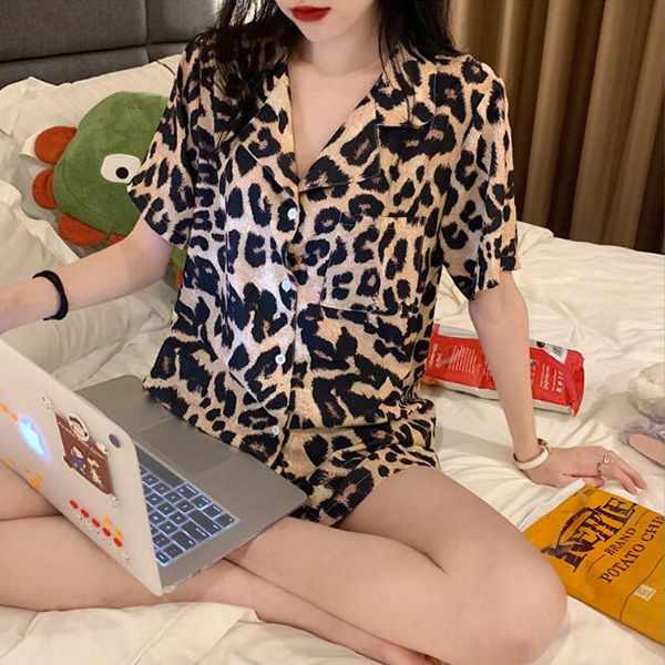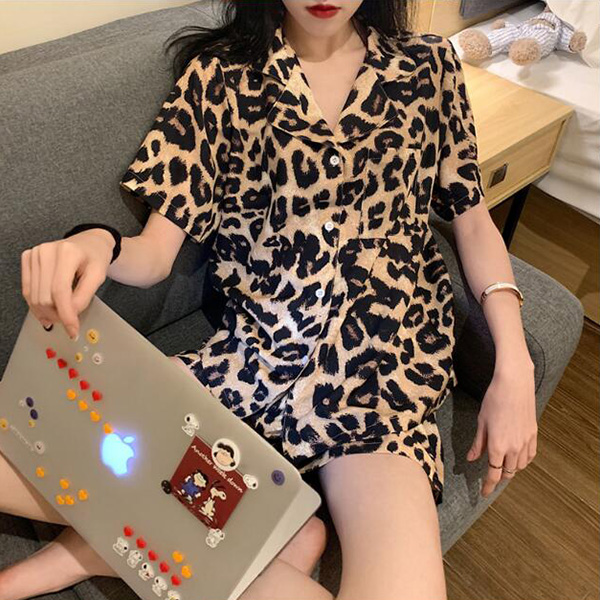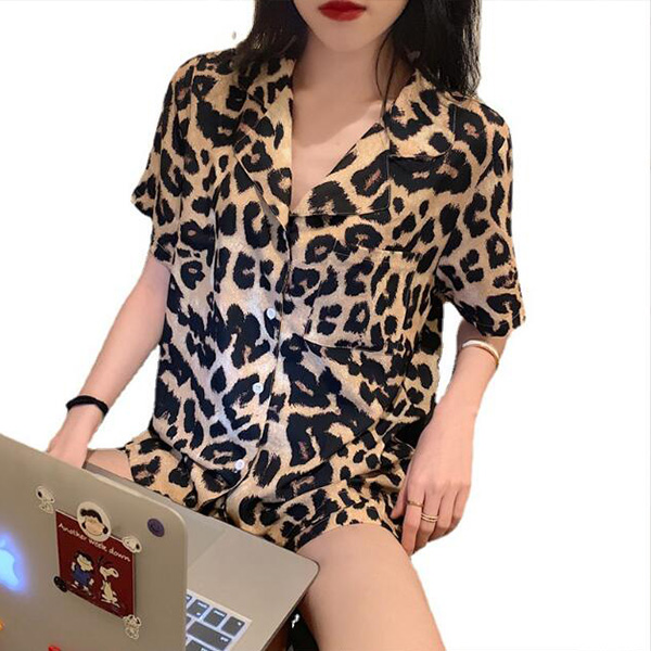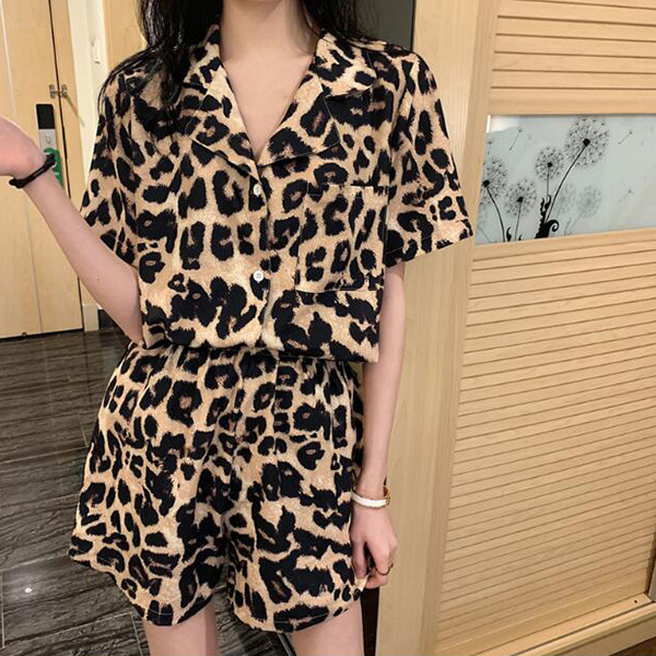 Leopard Print Short Pajama Set Loose Short Sleeve Top and Shorts