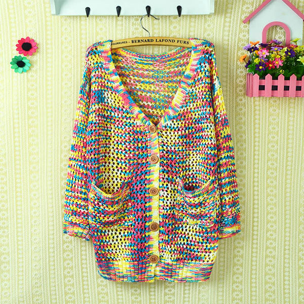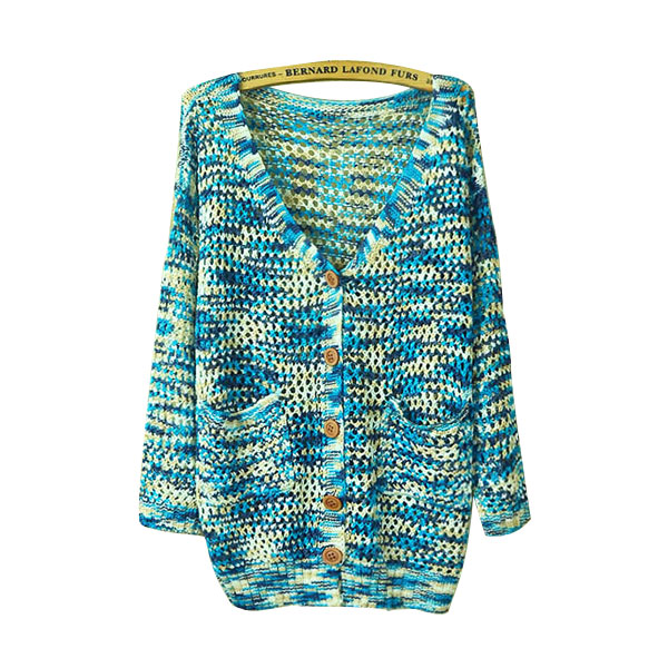 In fall, some times we just need a cardigan to keep us warm. So, fashion gals, you can choose this oversize cardigan. You can on top of a vest or a thin sweatshirt. The heat of this cardigan is the mixing color design. Its color looks colorful and brilliant. It has simple construction-V-necklace, long sleeve, two patch pockets and the ribbed trim. But, it looks gorgeous.