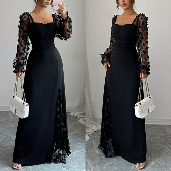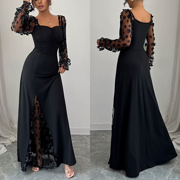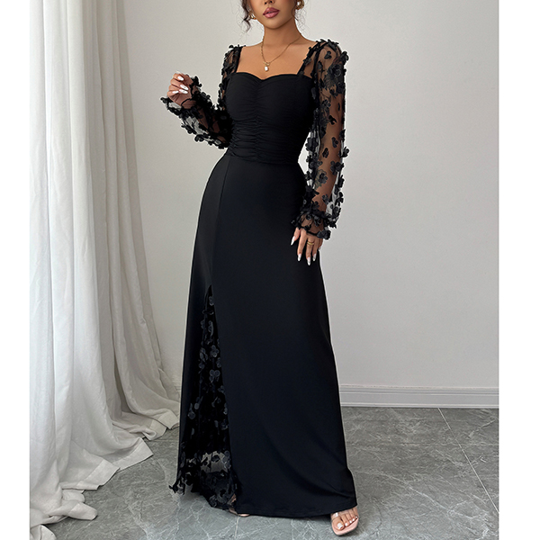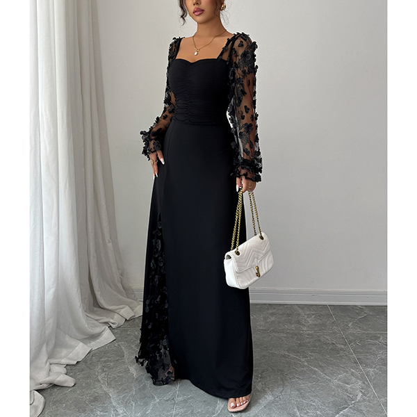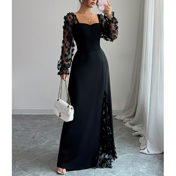 Long Sleeve Dress with Mesh Flower Detail on Sleeves
