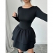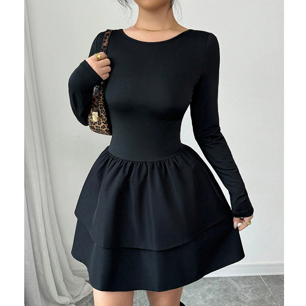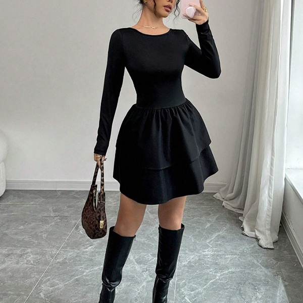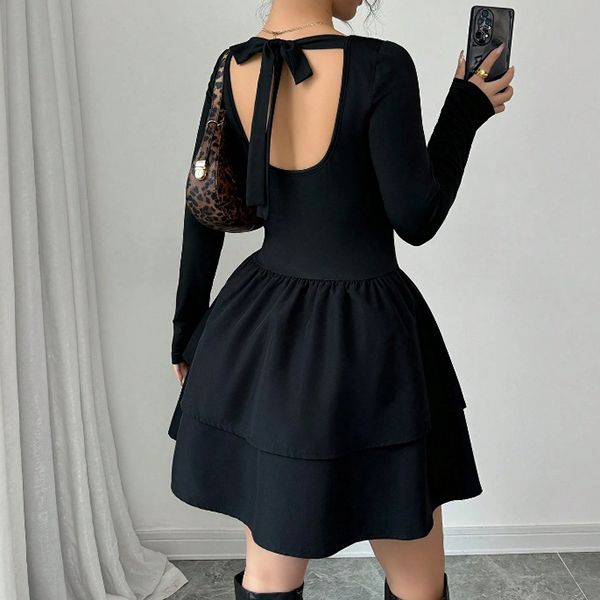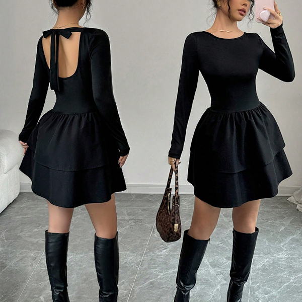 Fashion Crew Neck Long Sleeve Tiered Backless Mini Dress