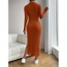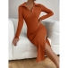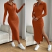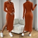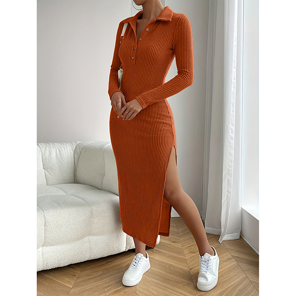 Fashion Stand Collar Button V-neck Long Sleeve Side Slit Ribbed Bodycon Dress