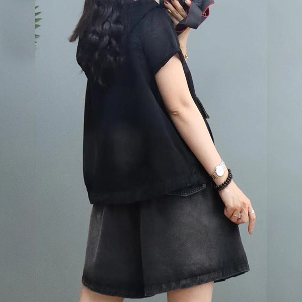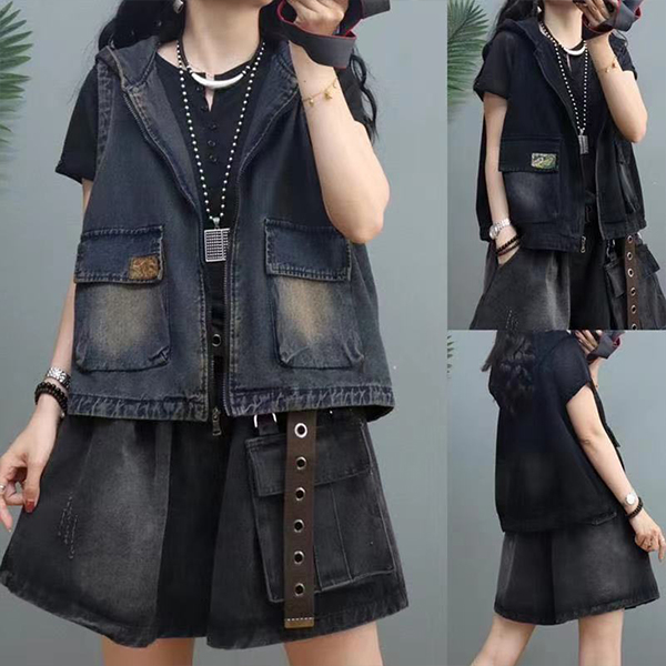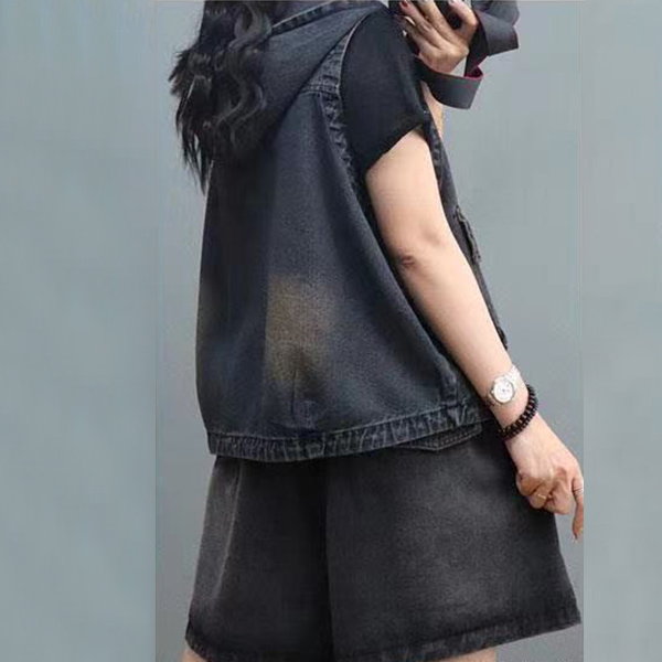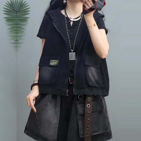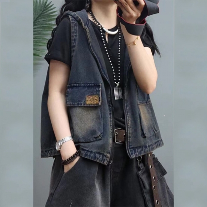 Loose Denim Vest Jacket with Hooded and Double Pockets