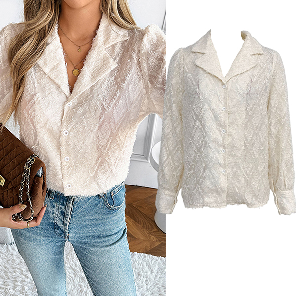 This Textured Fuzzy Blouse is a stylish and cozy piece that combines a classic silhouette with a textured fabric for a modern and chic look. The combination of the notch lapel, front button closure, and textured fabric makes this blouse a versatile and stylish option for various occasions. Pair it with tailored pants or a skirt for a sophisticated and polished look, or wear it with jeans for a more casual and chic ensemble.