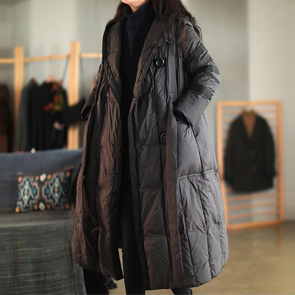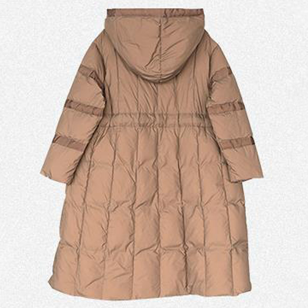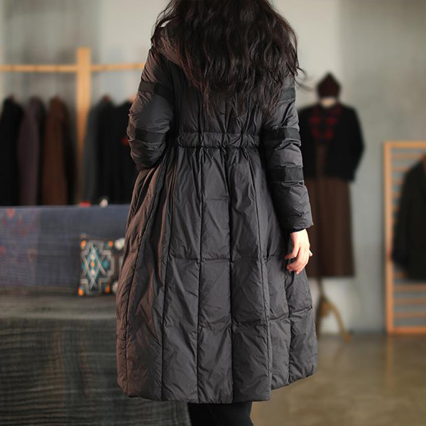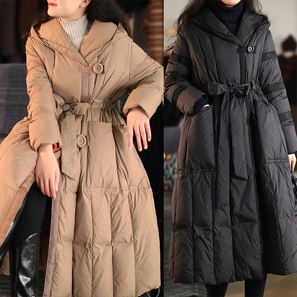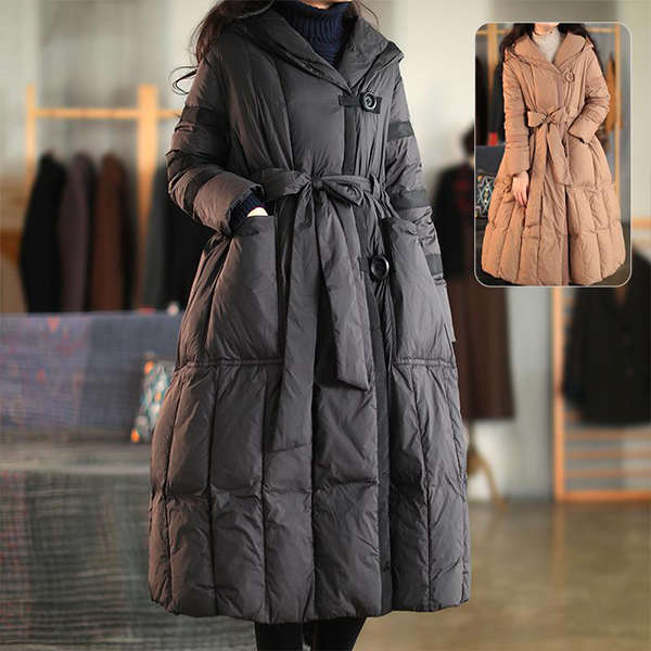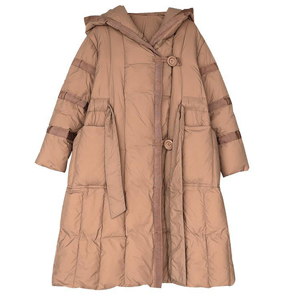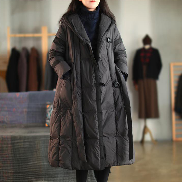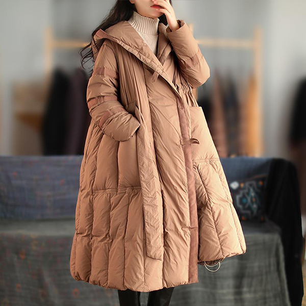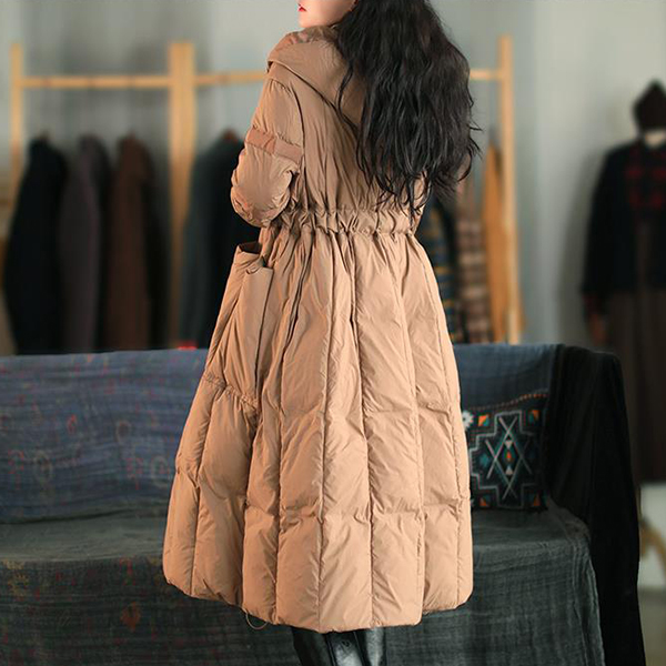 Loose-Fit Mid Length Down Jacket with Hood and Lace Up Waist