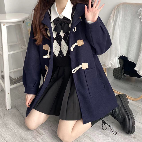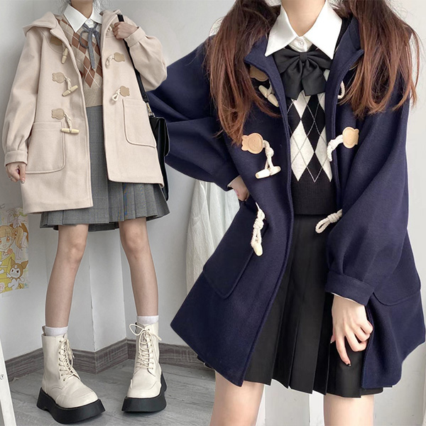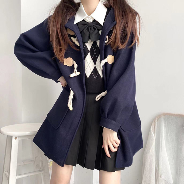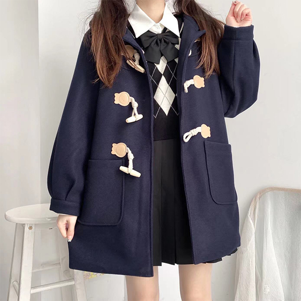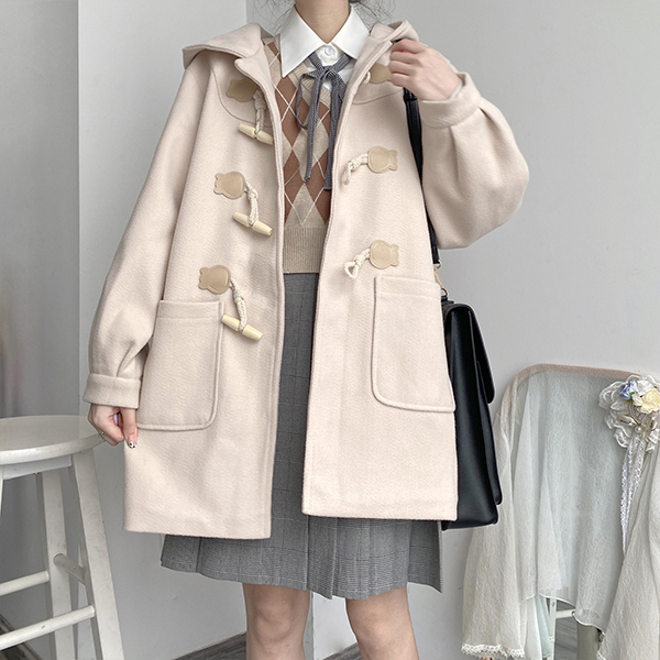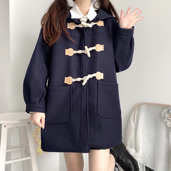 Loose Hooded Design Mid Length Coat with Horn Button