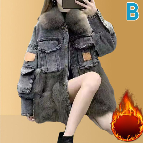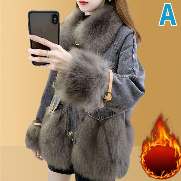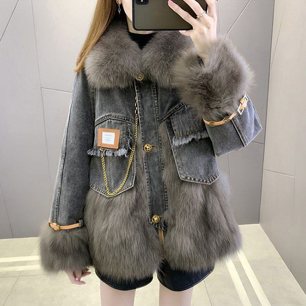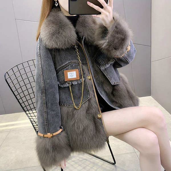 Mid Length Denim Coat with Faux Fox Fur Trim