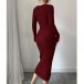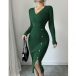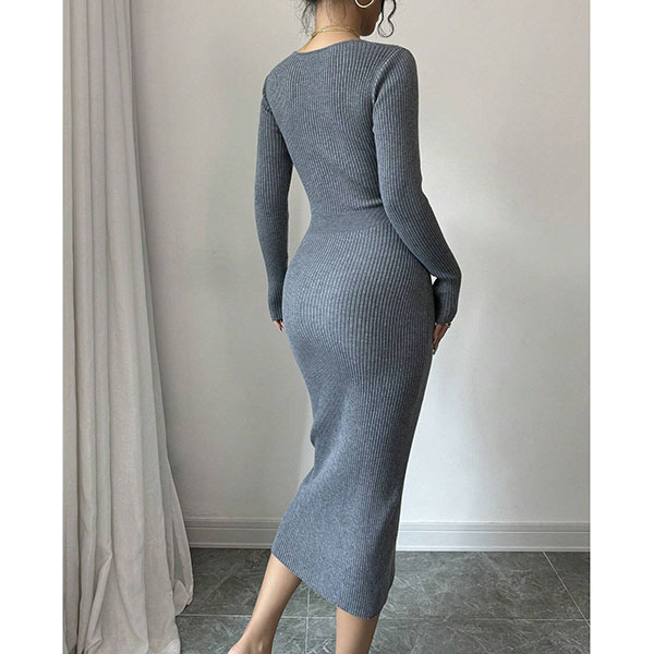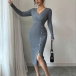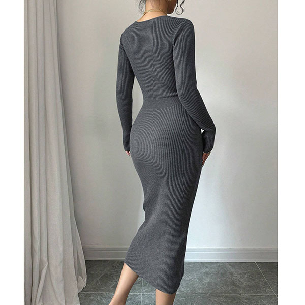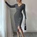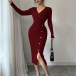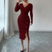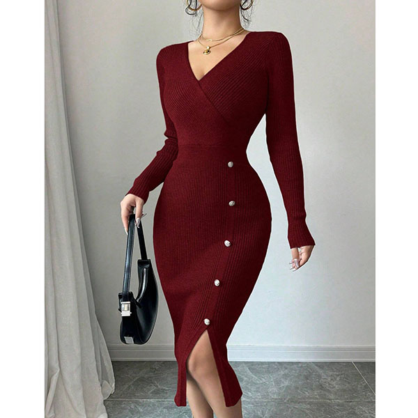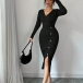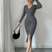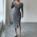 Fashion V-neck Long Sleeve Side Button Side Slit Bodycon Ribbed Dress