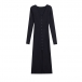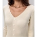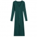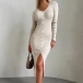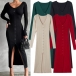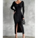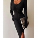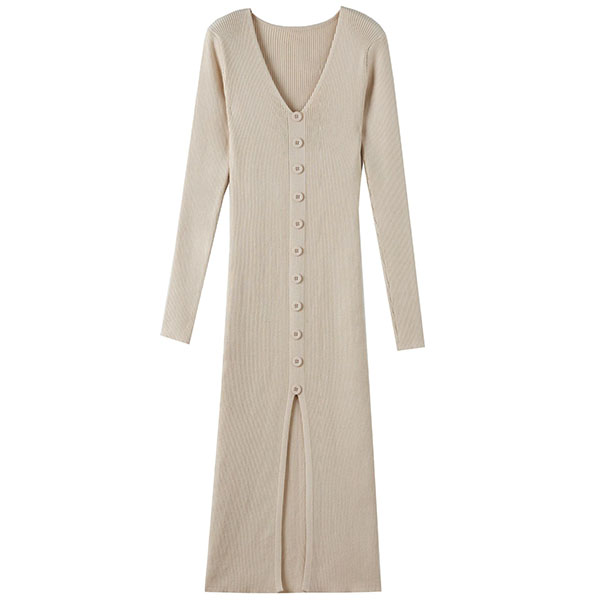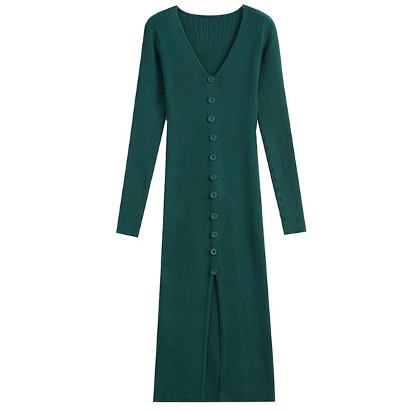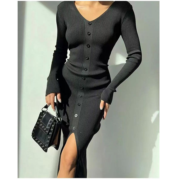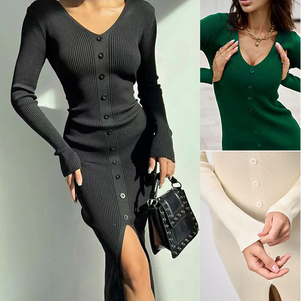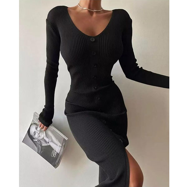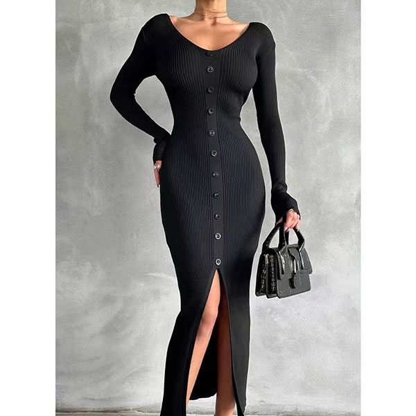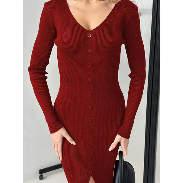 Fashion Solid Color Long Sleeve V-neck Front Button Slit Ribbed Bodycon Dress