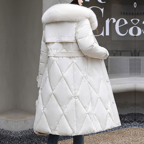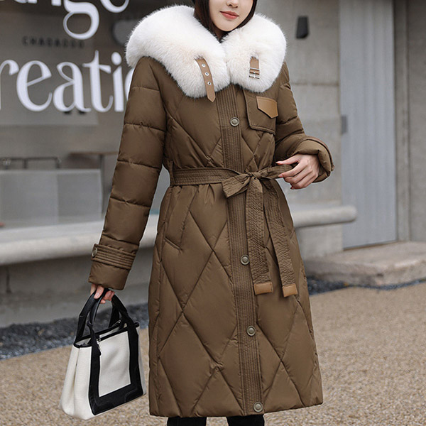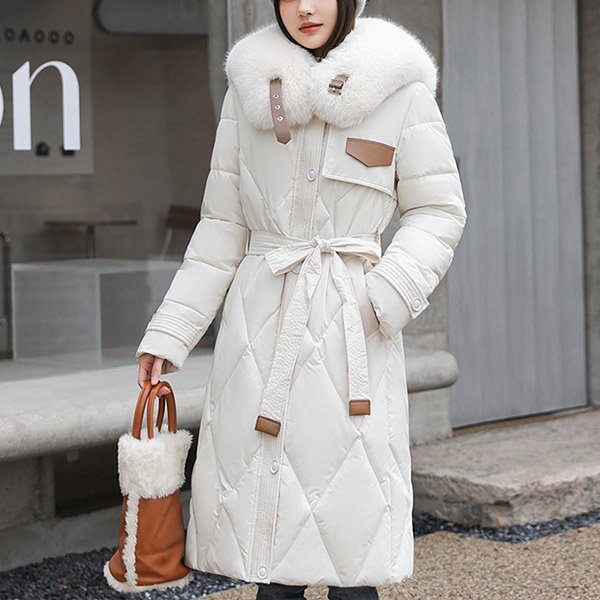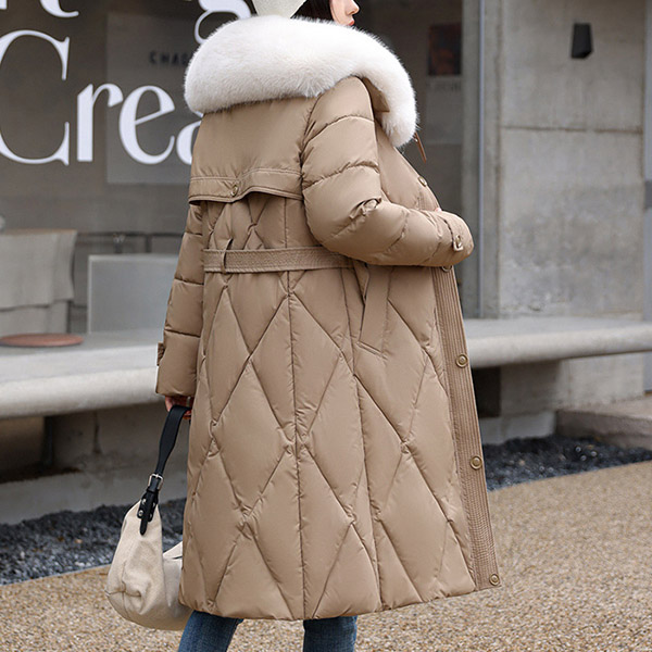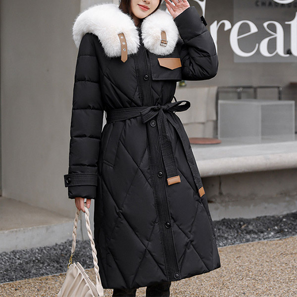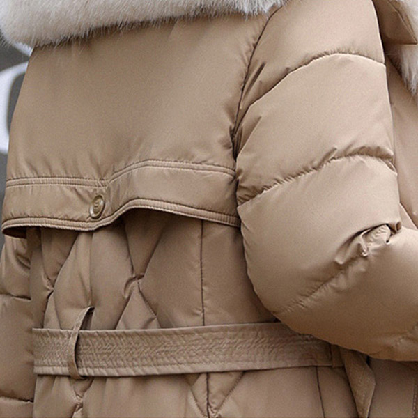 Mid Length Over the Knee Padded Winter Coat with Large Faux Fur Collar and Belted Waist