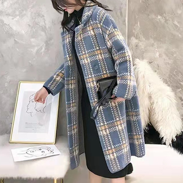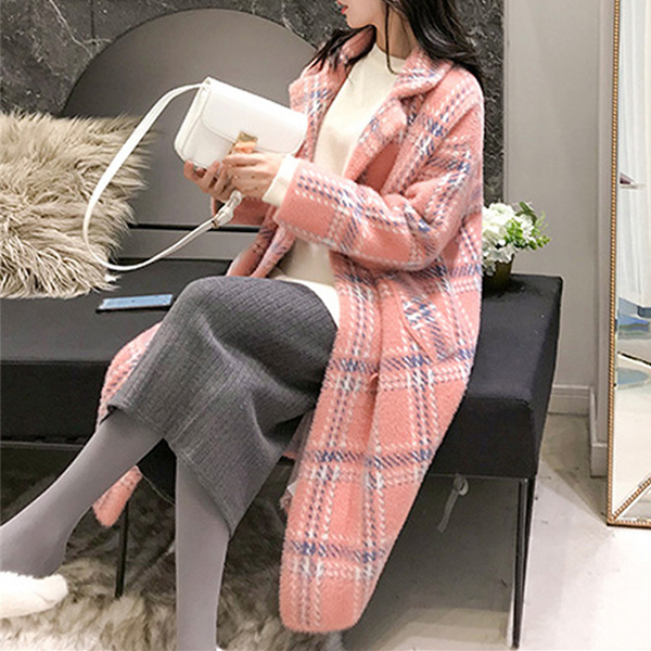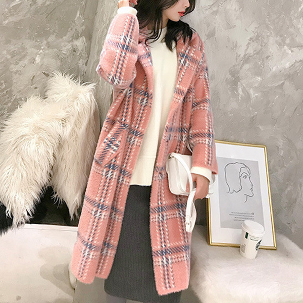 Mid Length Plaid Coat Loose Thickened Woolen Cardigan Coat