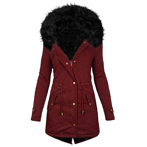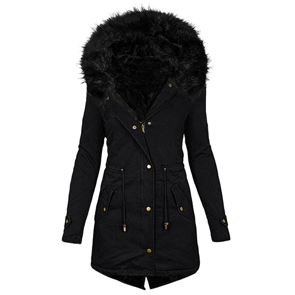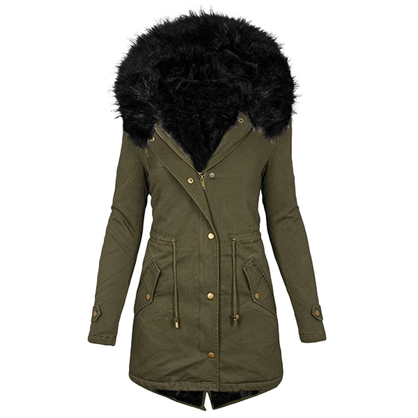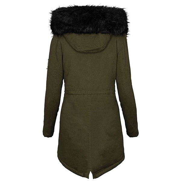 Mid Length Plush Warm Hooded Coat with Waist Drawstring