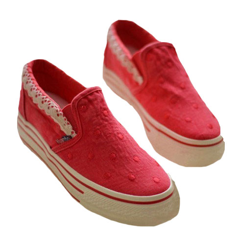 Leisure time, leisure suit. Put in our leisure loafer and pair with a loose fitting T-shirt and a frayed shorts, you will looks cute and leisure. This pair of red loafers features the lace spliced and the polka-dot pattern. Those designs add fashion and cool element to this pair of shoes. Have one, you and your lovely style will be welcome anywhere!