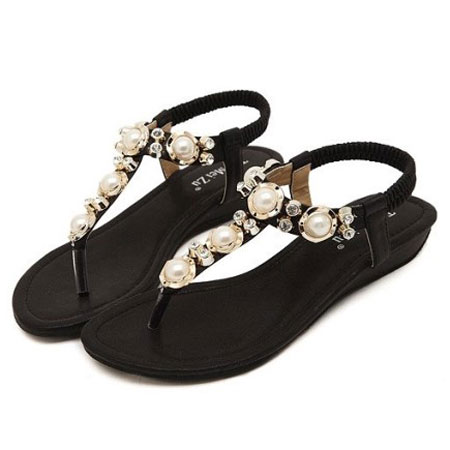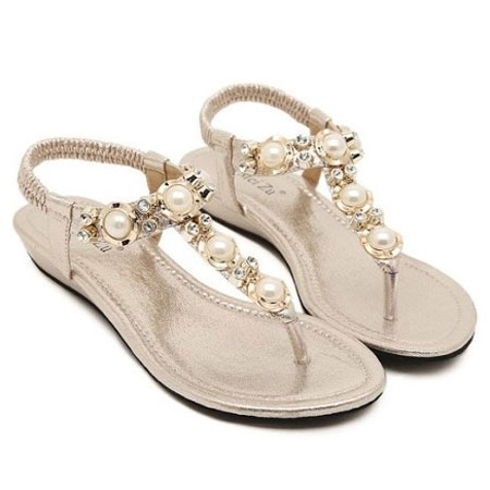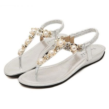 The pair of low-heel thong sandal features a faux leather,a durable rubber sole and an elastic ankle strap and it is adorned with rhinestones and beads at the T strap.It would look great with a full-length dress.