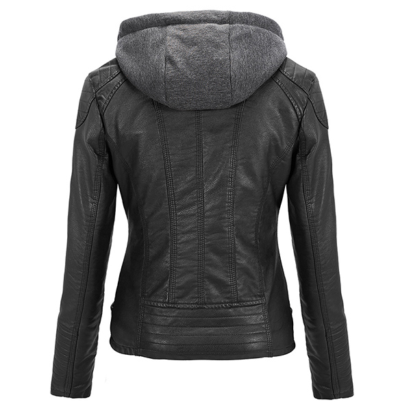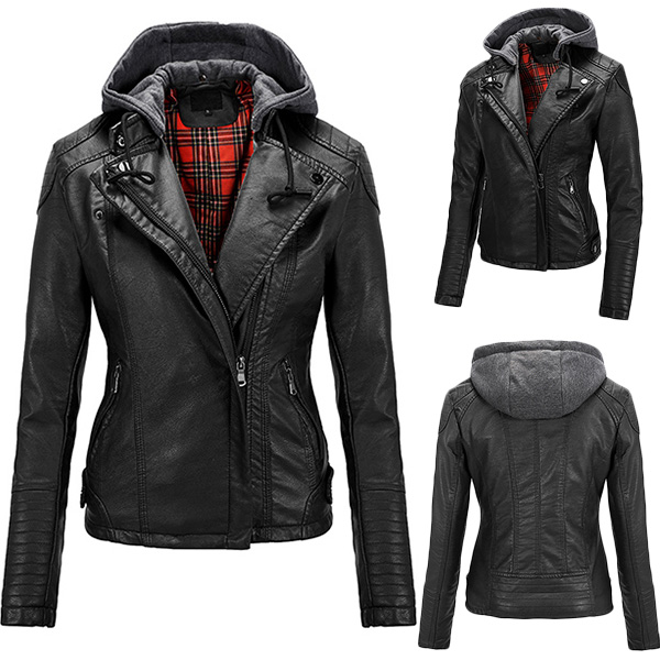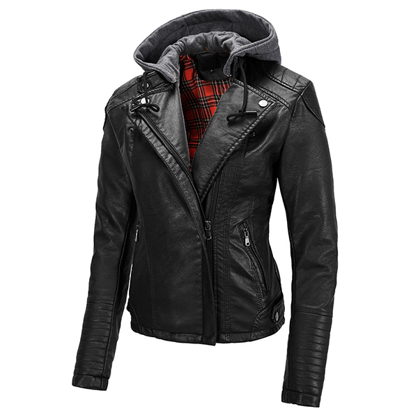 Fashion Detachable Hoodied Laple Side Zipper Artficial Leather PU Jacket for Women