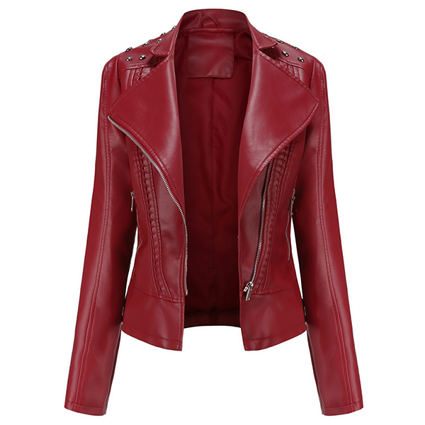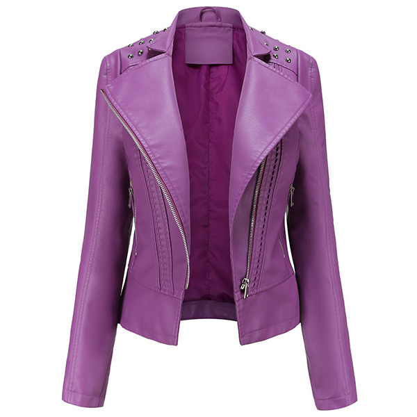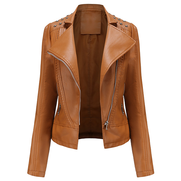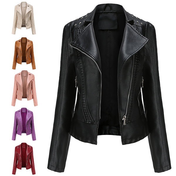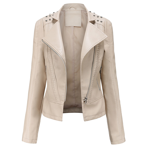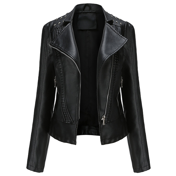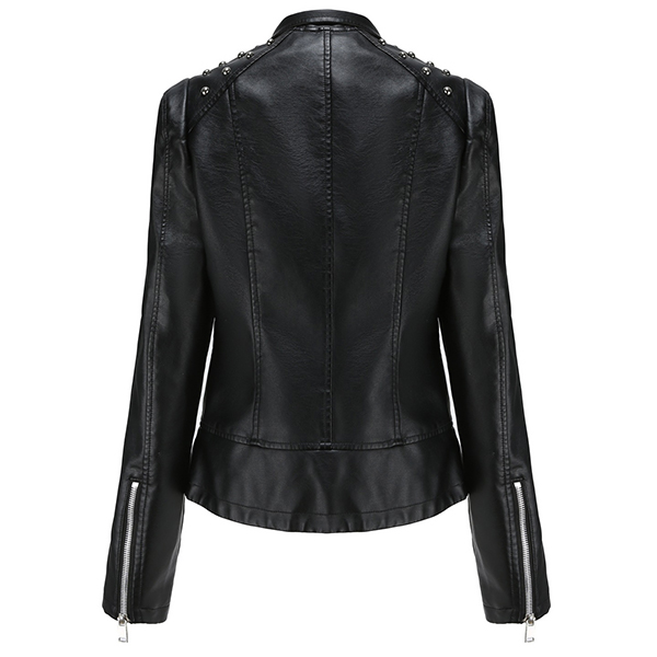 Motor Fashion Rivet Notch Lapel Slant Zipper Artificial Leather Jacket