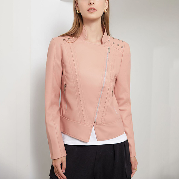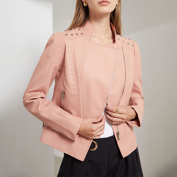 The rivet detailing along the lapel adds a touch of boldness and attitude to the jacket. The notch lapel adds a classic and timeless touch to the jacket. The slant zipper detail not only serves as a functional closure but also adds an edgy and trendy element to the jacket.