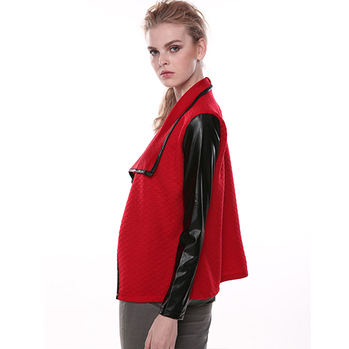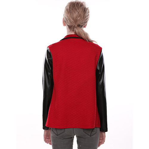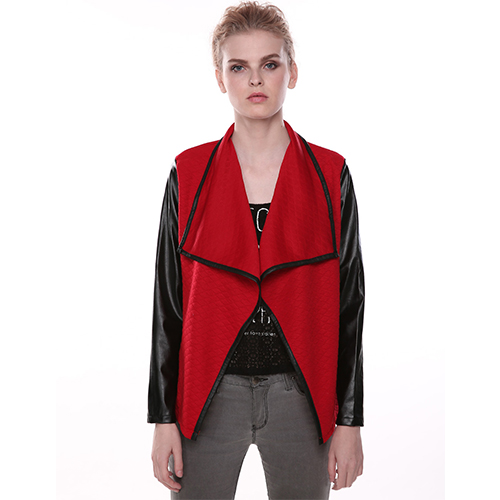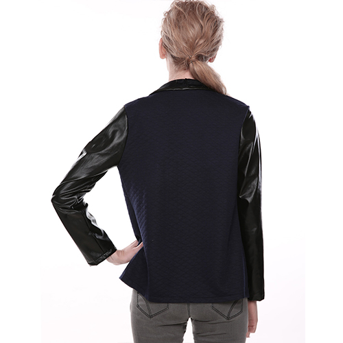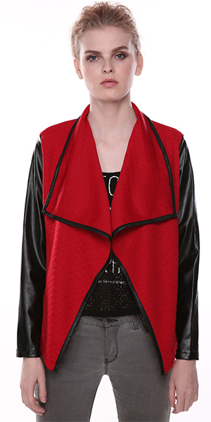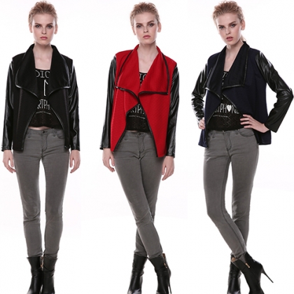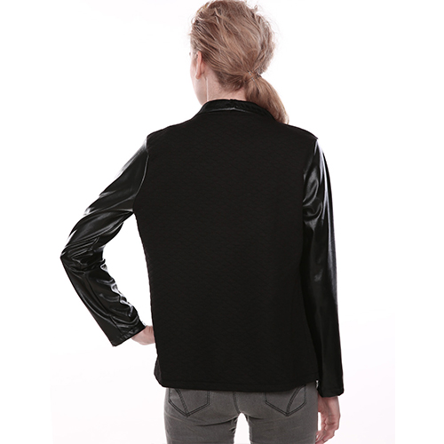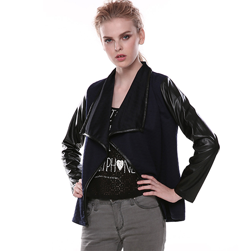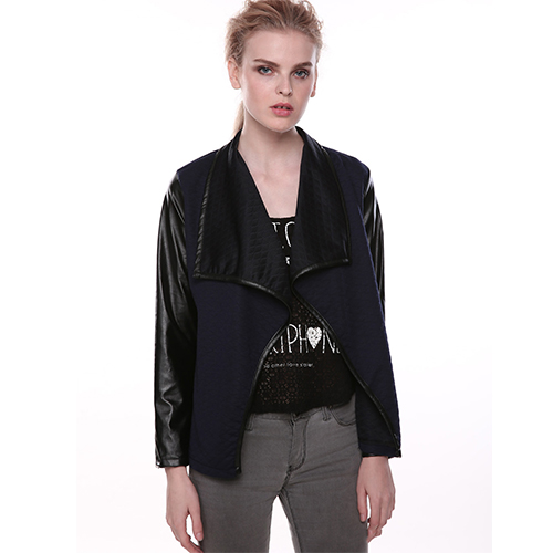 at your first sight. Features long sleeve with PU leather spliced design, the front has two big lapels,