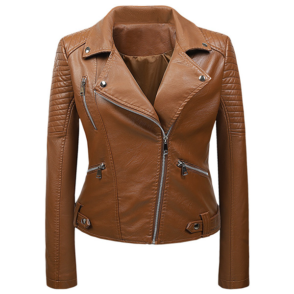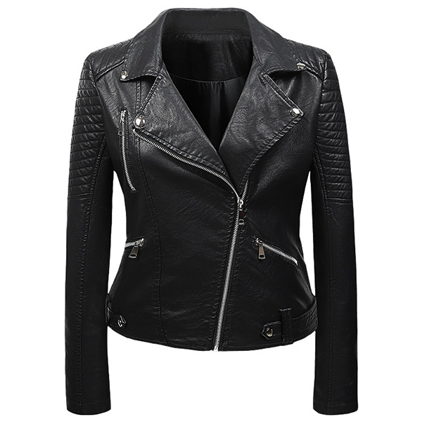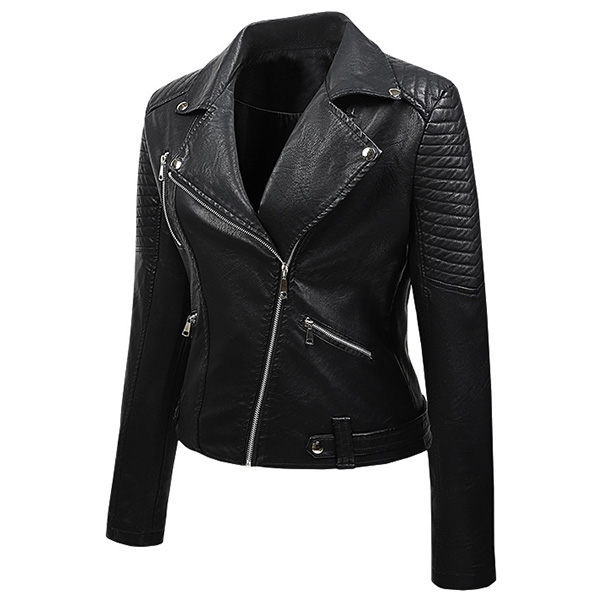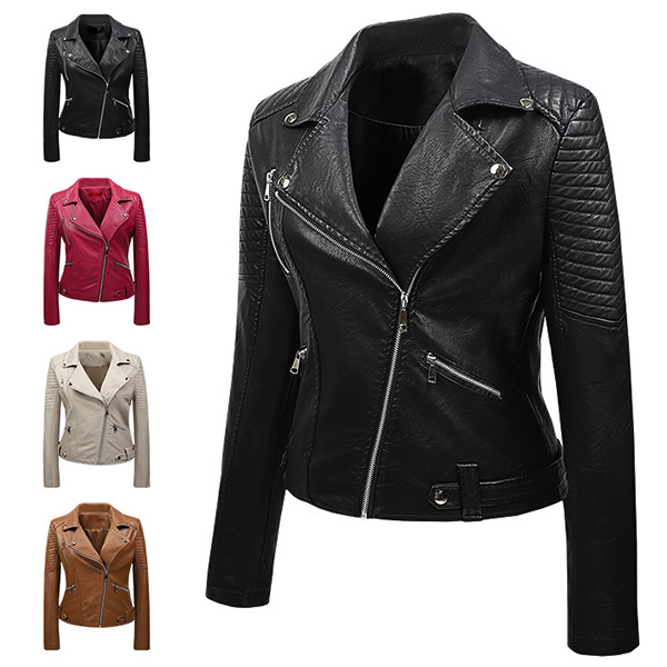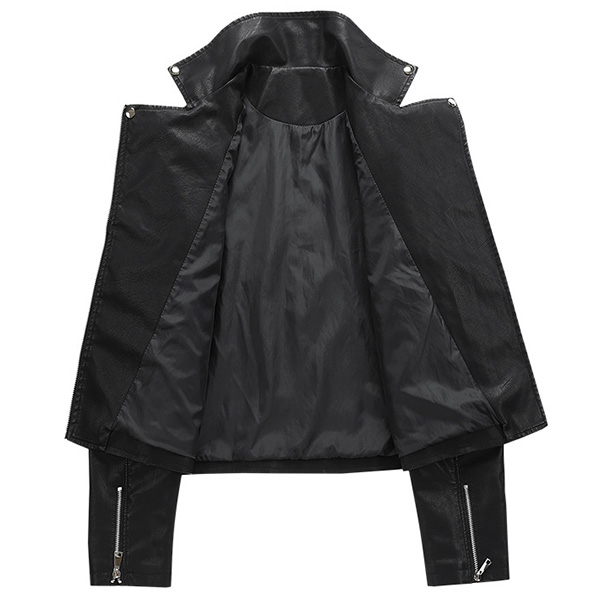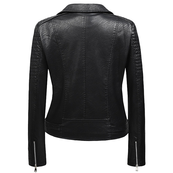 Motor Style Notch Lapel Long Sleeve Slant Zipper Artificial Leather PU Crop Jackets