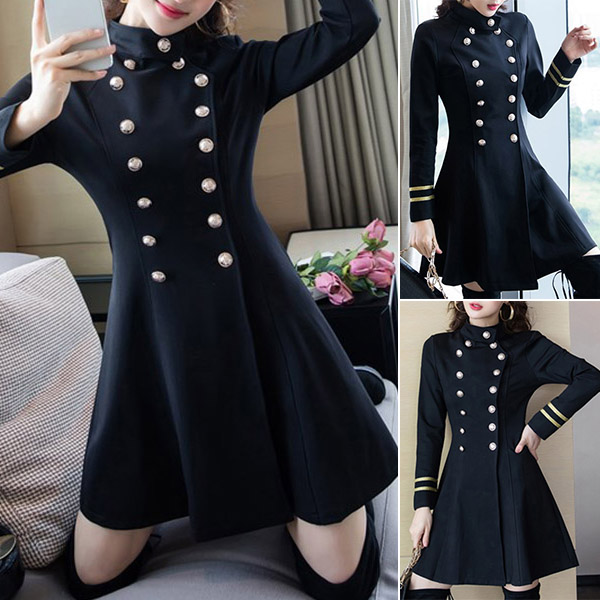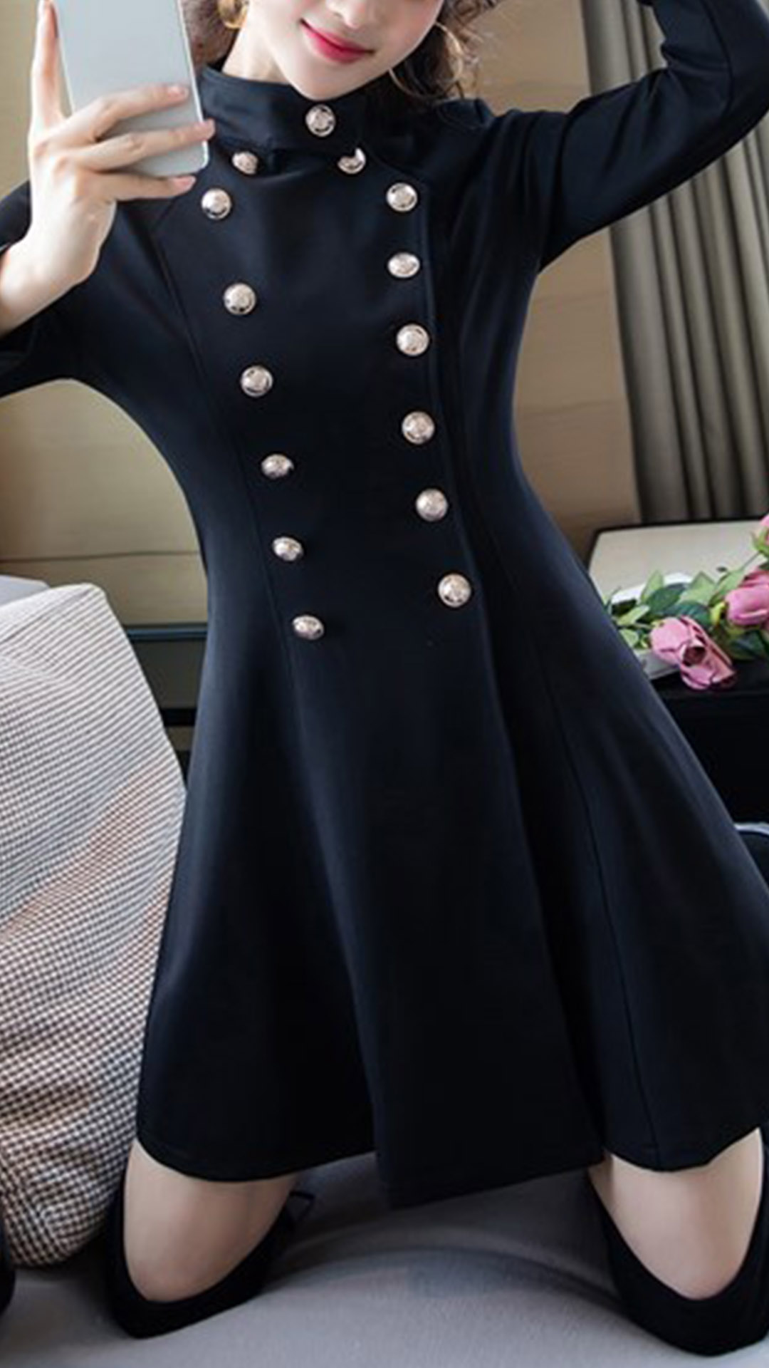 Wanna a navy style outfit? Then look no further than this dress. It is finished with long sleeve,stand collar,double-breasted and a fit silhouette,this dress not only can showcase your slender figure,but also can exude your style and charm. You can match it with your over-the-knee boots for a charming look!