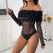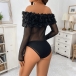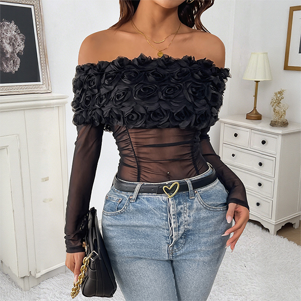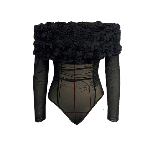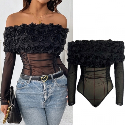 Fashion 3D Floral Off-the-shoulder Long Sleeve Semi-through Bodysuit
